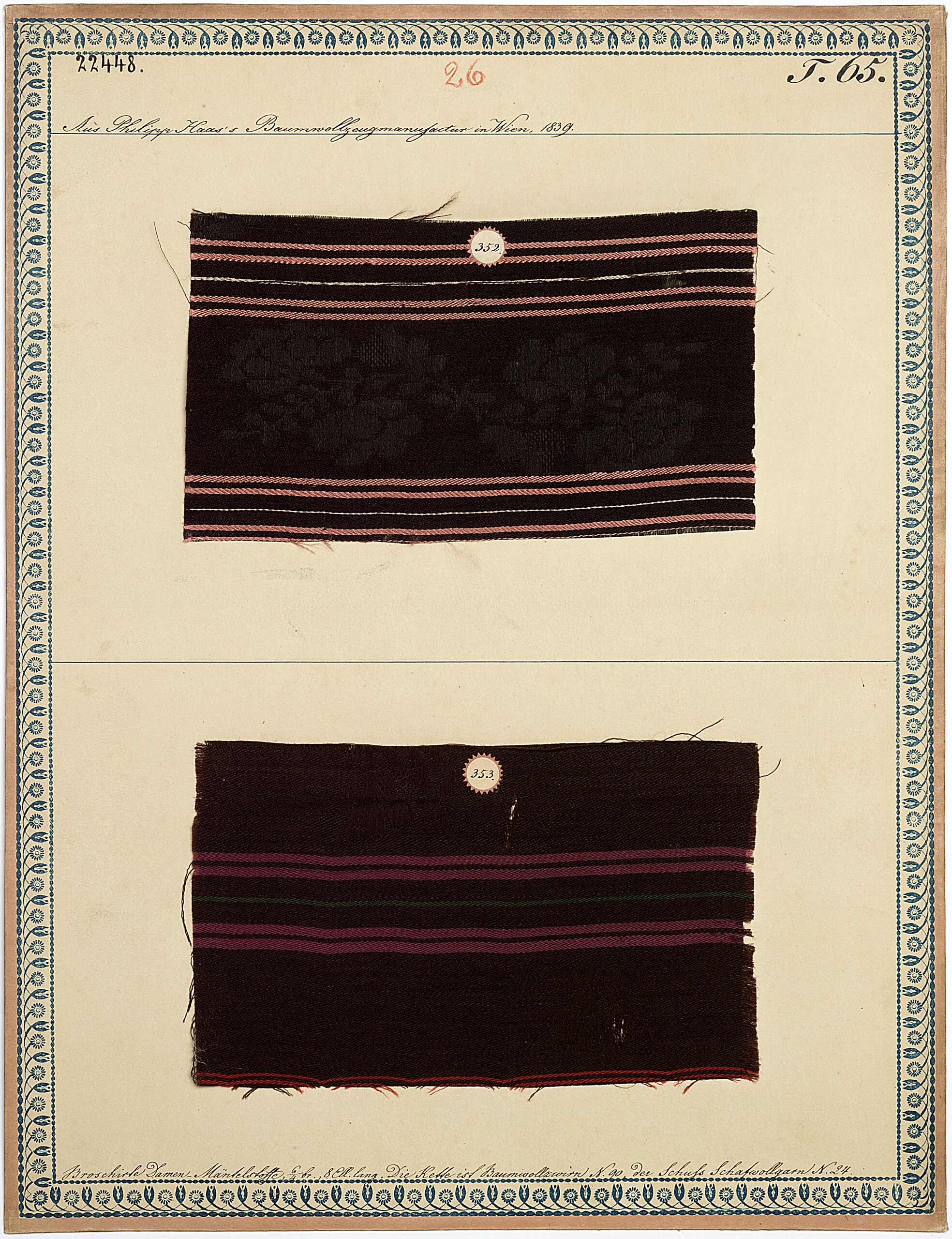 - label (front) : Aus Philipp Haas's Baumwollzeugmanufactur in Wien, 1839. / Broschirte Damen-Mäntelstoffe, 6/4 br., 8 Ellen lang. Die Kette ist Baumwollzwirn N. 90, der Schuß Schafwollgarn N. 24.