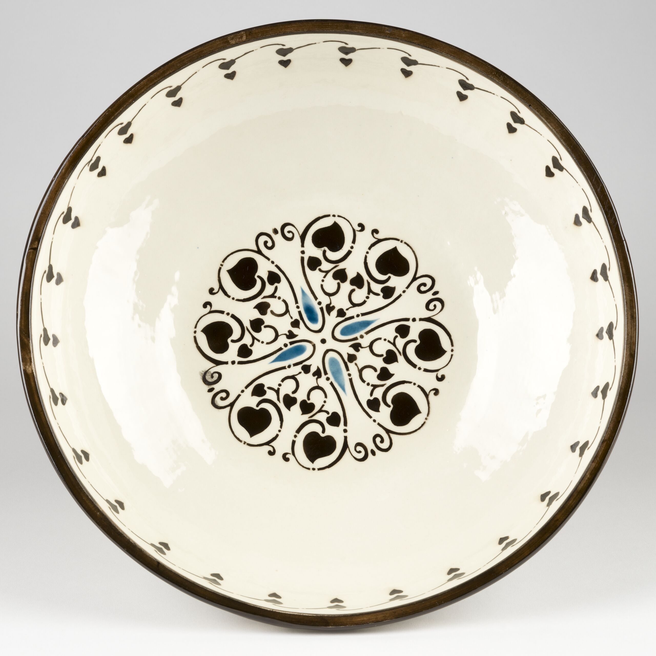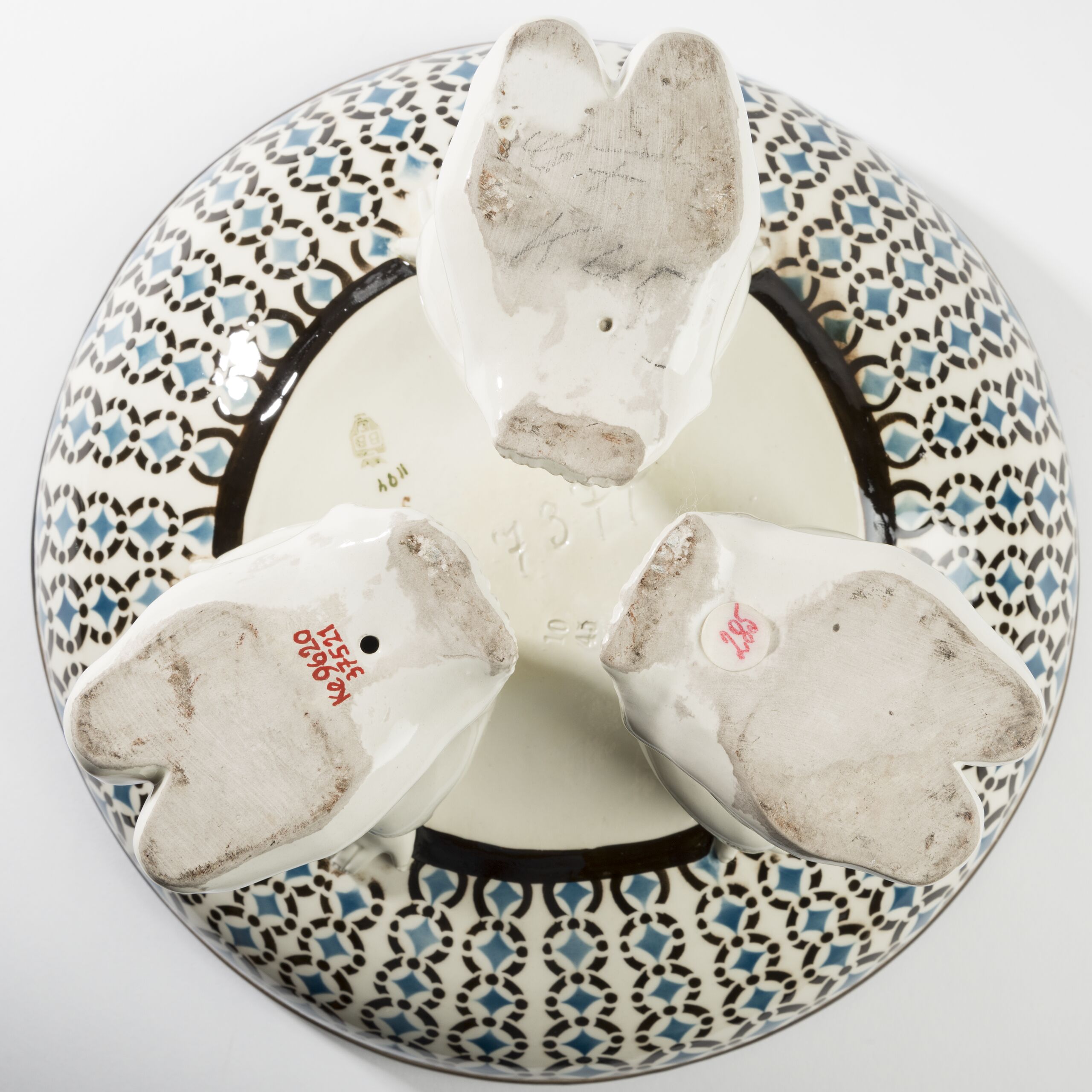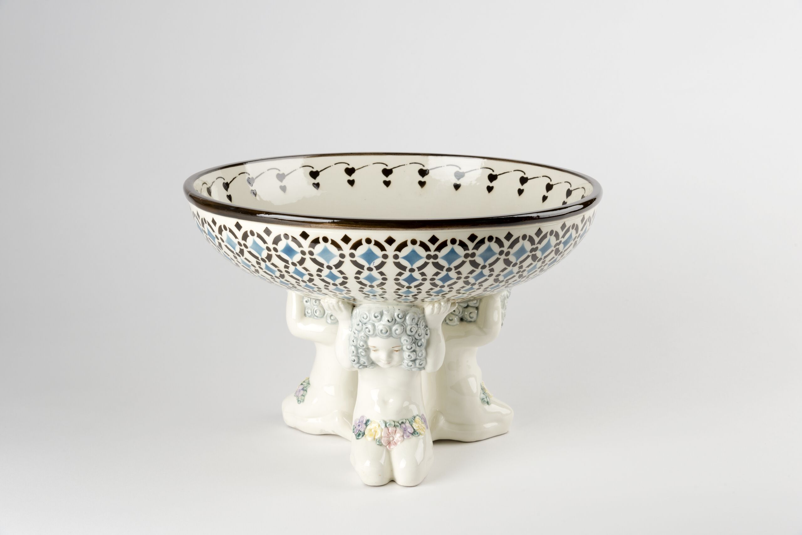Tafelaufsatz mit drei Putten, Schale mit drei gegossenen, garnierten knienden Putti, Steingut, heller Scherben, gegossen, garniert, Putti mit Lendenschurz aus bunt bemalten Blumen, tragen Schale mit bemalten Ornament in blau und schwarz, innen Herzmotiv, transparent, glänzend glasiert