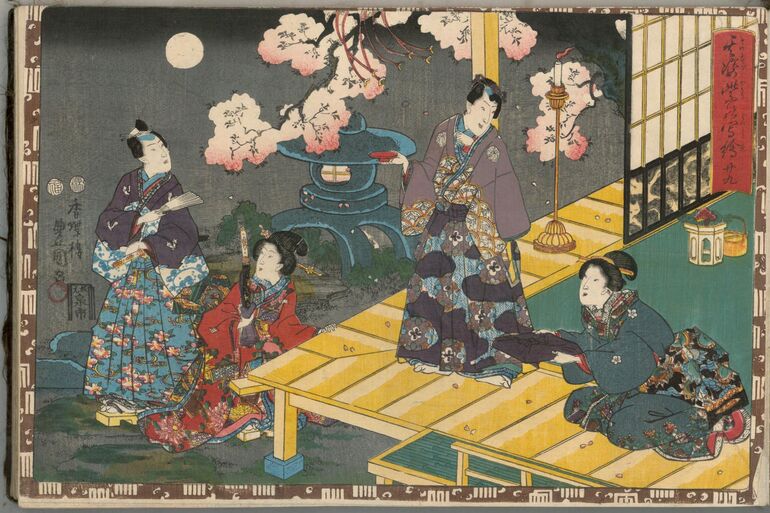 Album mit Genji-Serie von Hiroshige (5 Blätter) und Genji-Serie von Kunisada (49 Blätter). Die Serie von Kunisada im edozeitlichen Stil. Hier das 32. Blatt von Kunisadas Serie.