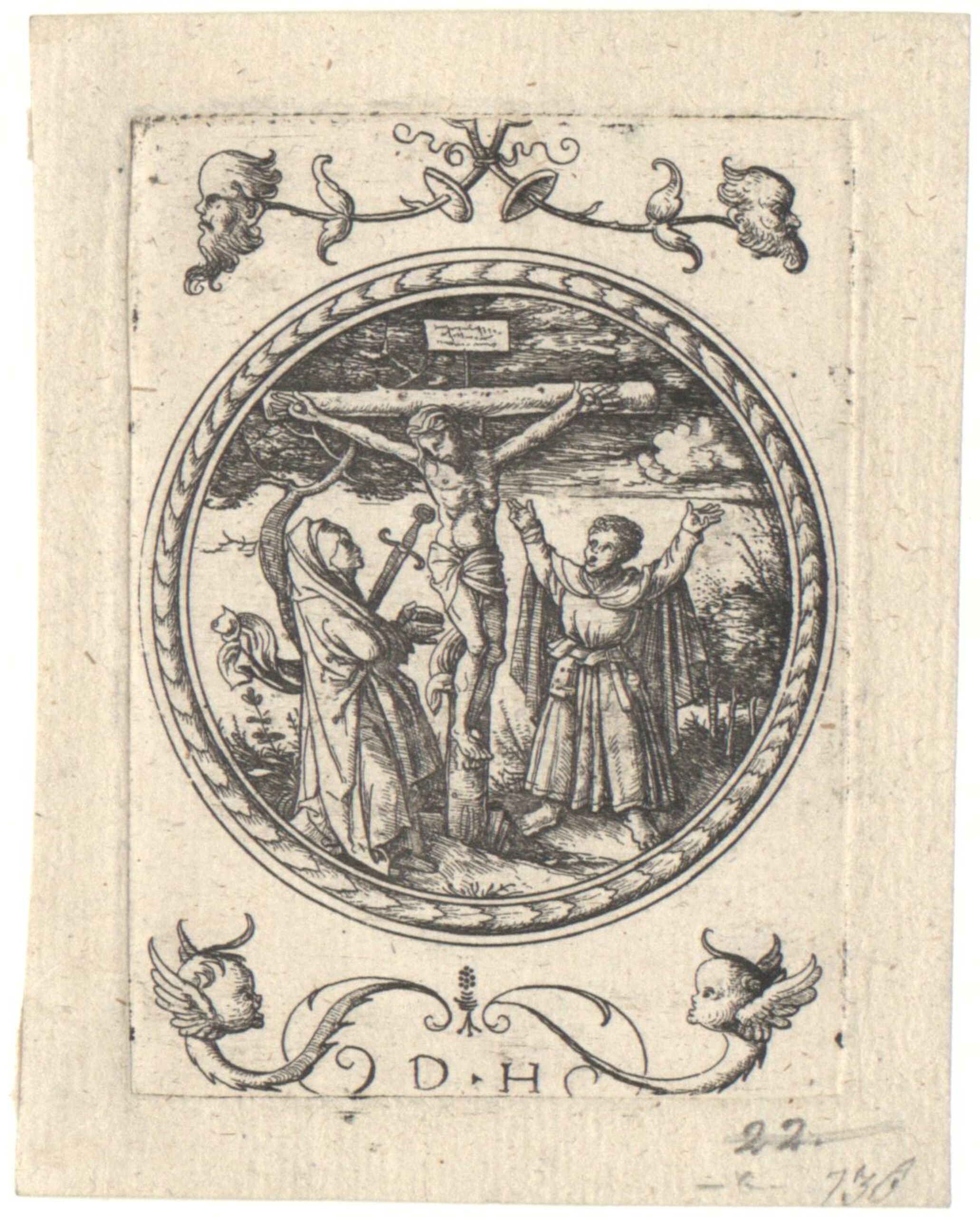 Druckgrafik, Christus am Kreuz mit Johannes, Maria und zwei Soldaten, in einem runden Rahmen, Daniel Hopfer, MAK Inv.nr. KI 906