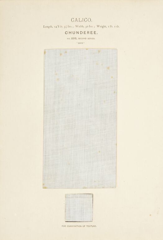 - text on object: COTTON TROUSERINS. / Length, 3 Yds. 33 Ins.; Width, 26 ½ Ins.; Weight, 1 Ib. 9 OZ. 10 dr. / COORLA MILLS, BOMBAY / NO. 789, SECOND SERIES. / "11742" / FOR EXAMINATION OF TEXTURE