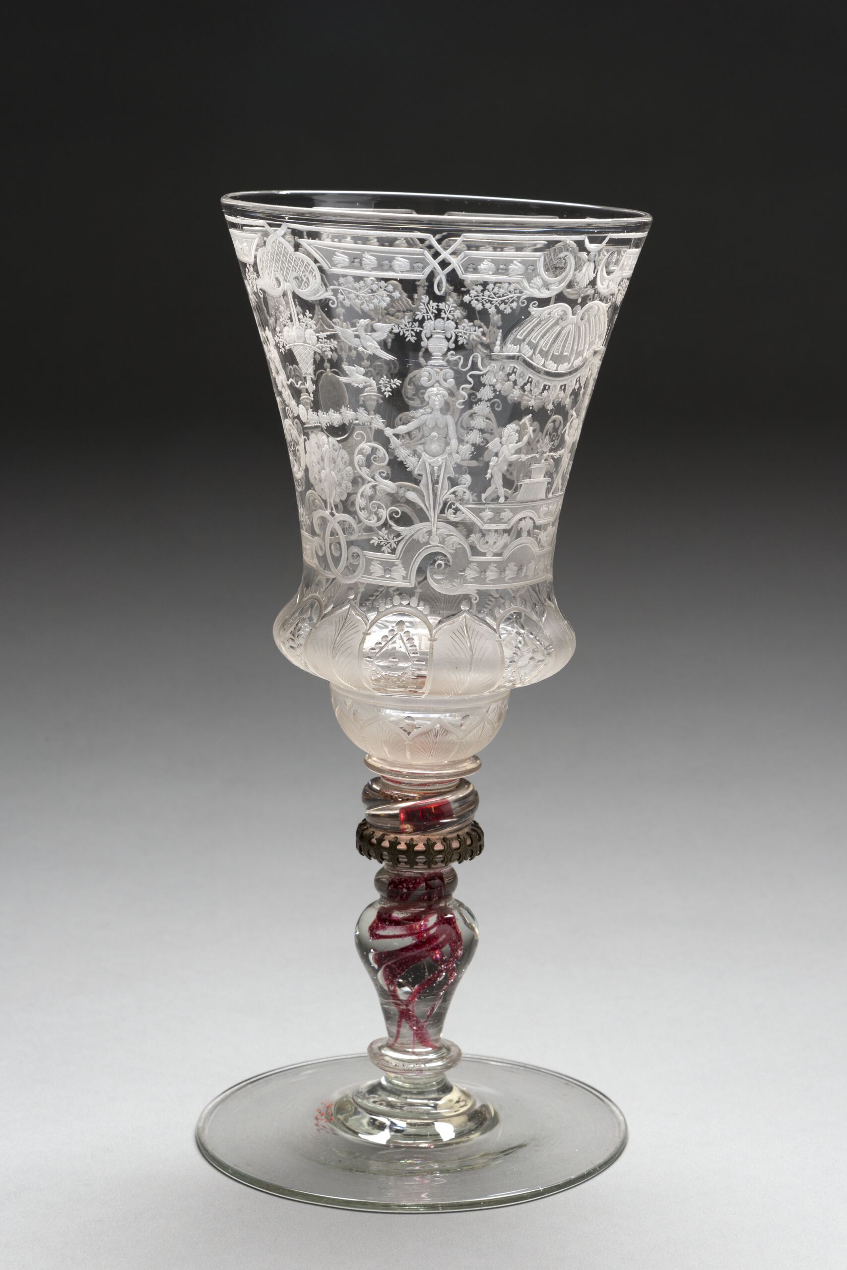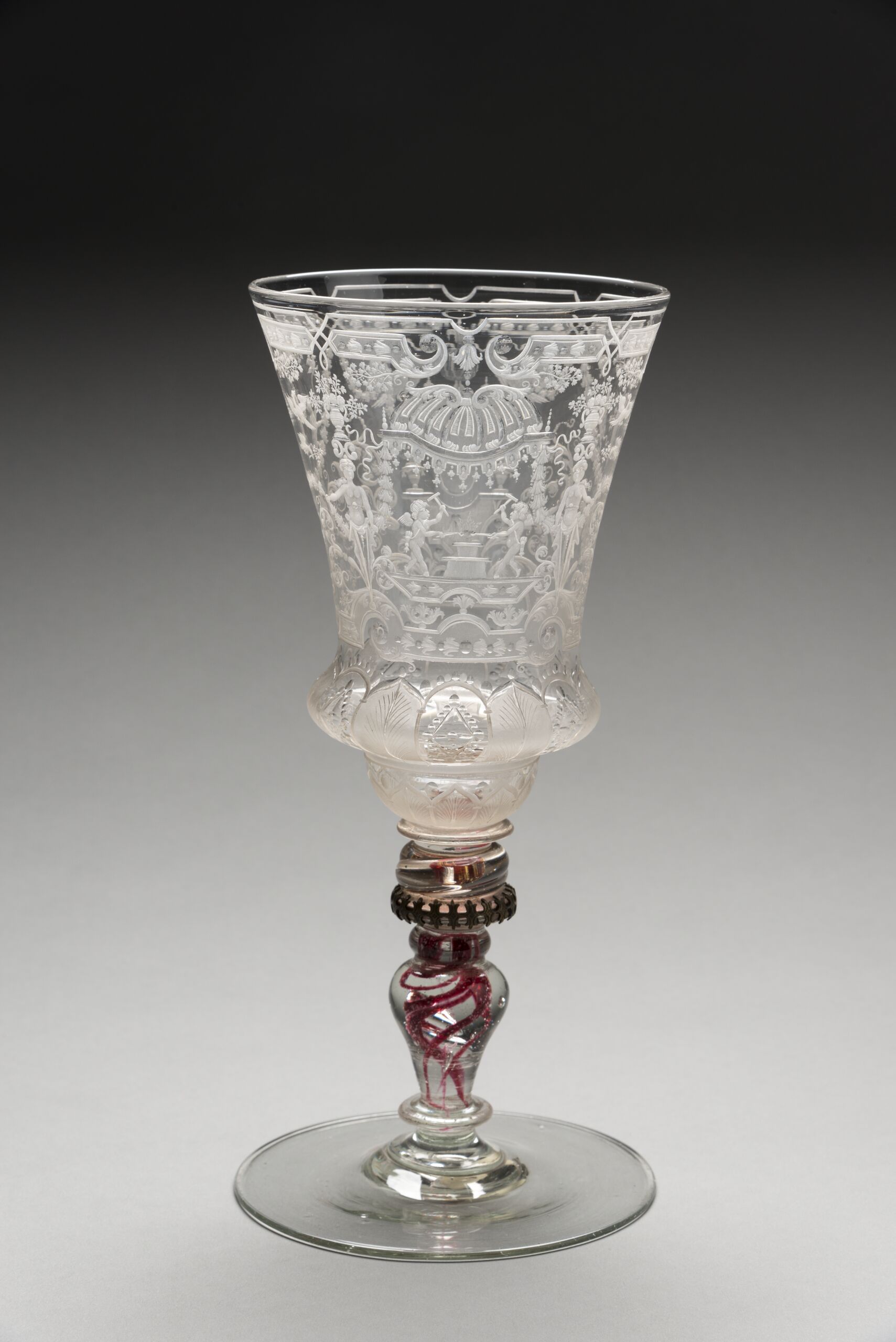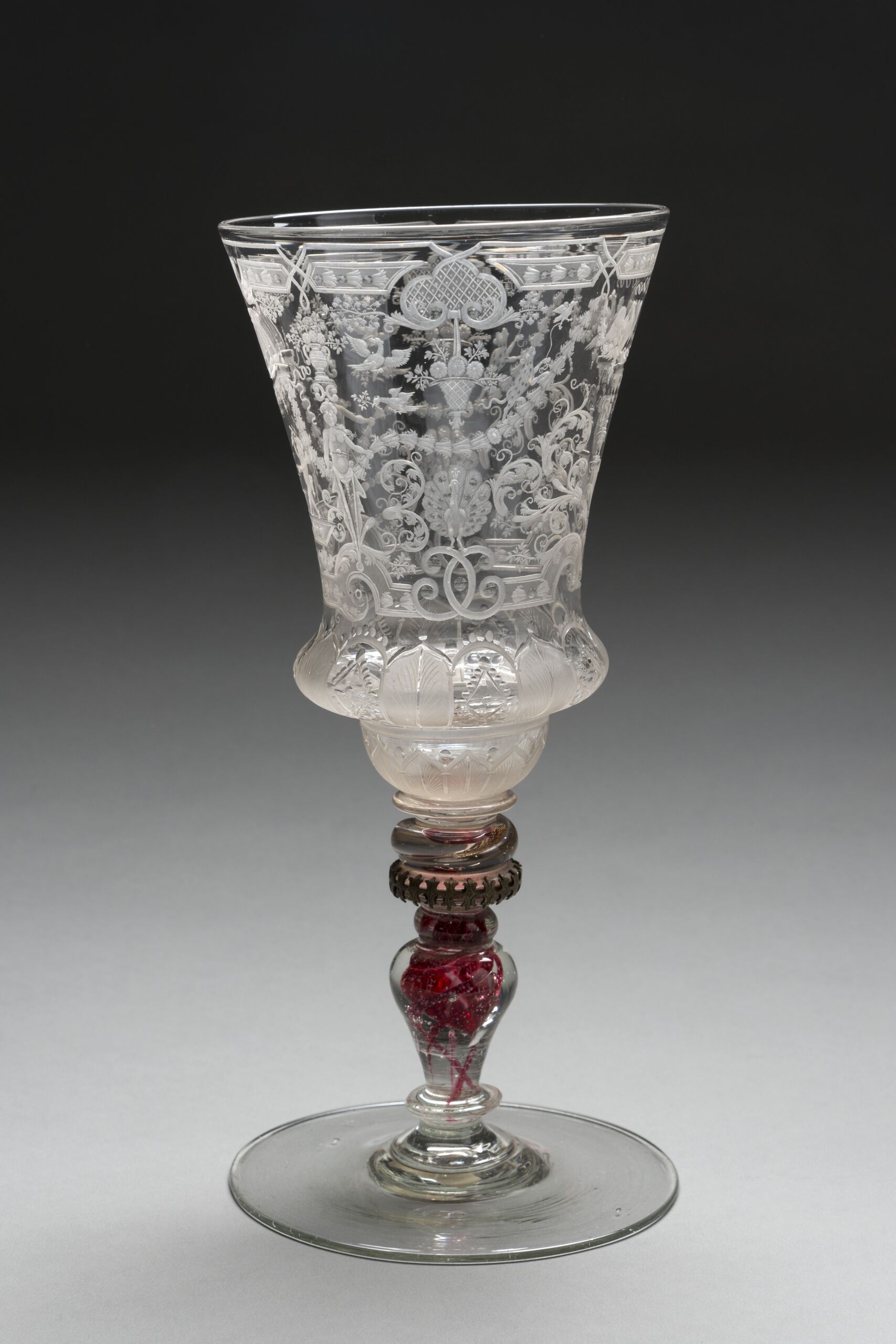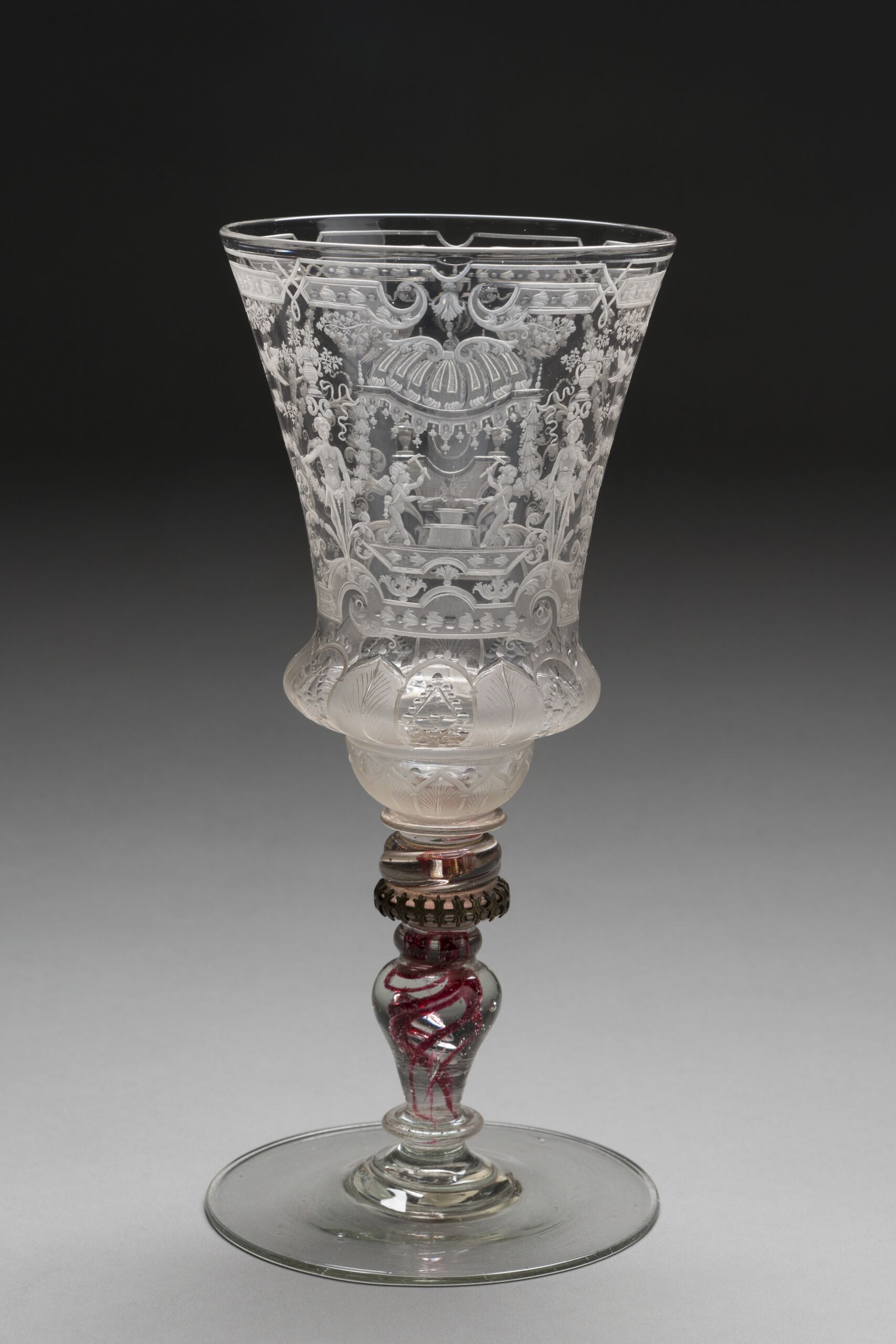 geschnitten, auf der Kuppa Laub- und Bandelwerkgrotesken, Baldachin, Amoretten beim Herzschmieden, Karyatiden, Vögel, Girlanden u.a. Am Kuppawulst ein Blattfries, Schaftfragment, gedrehterNodus mit Gold- und Rubinfäden, der übrige Schaft und der Fuss sind ergänzt