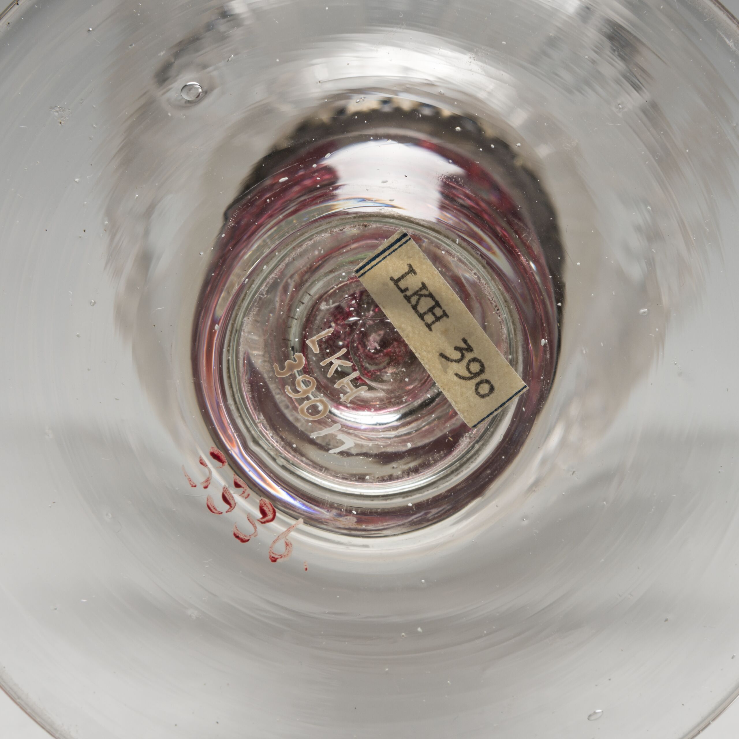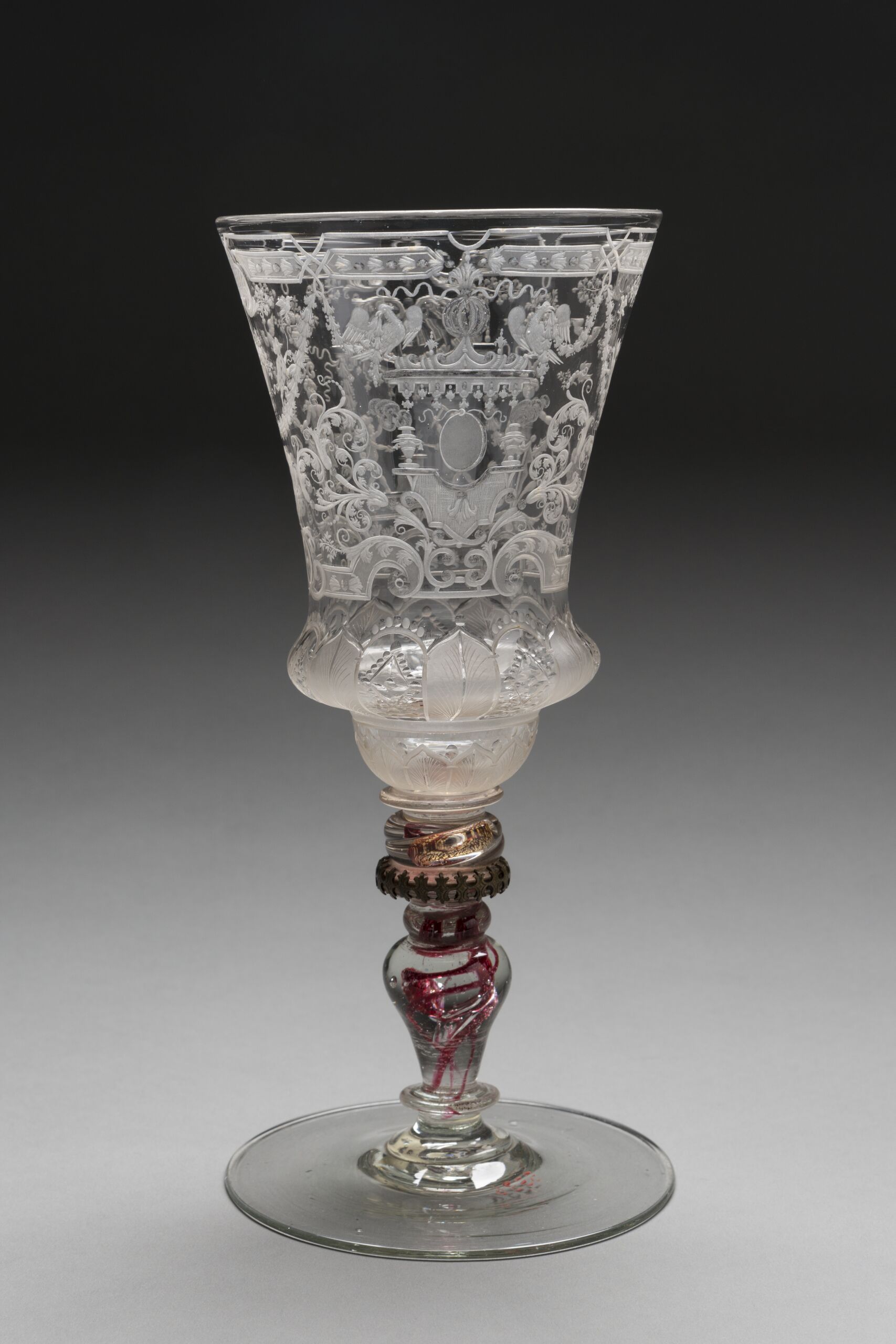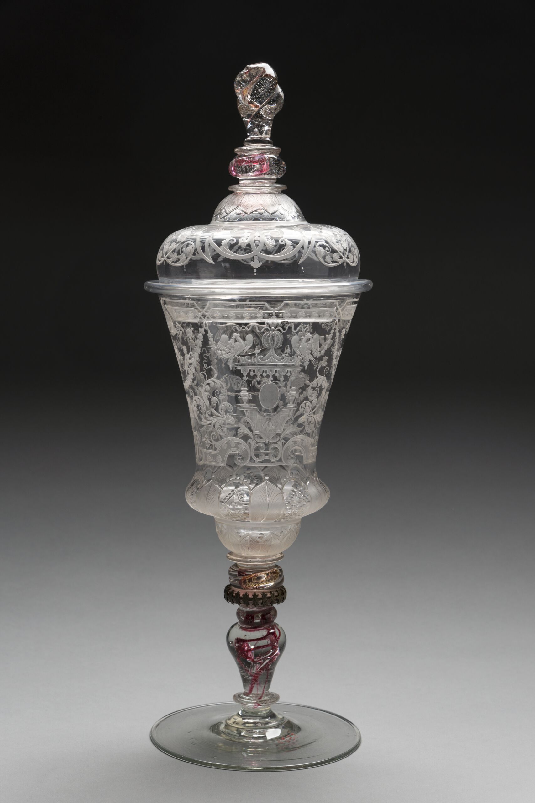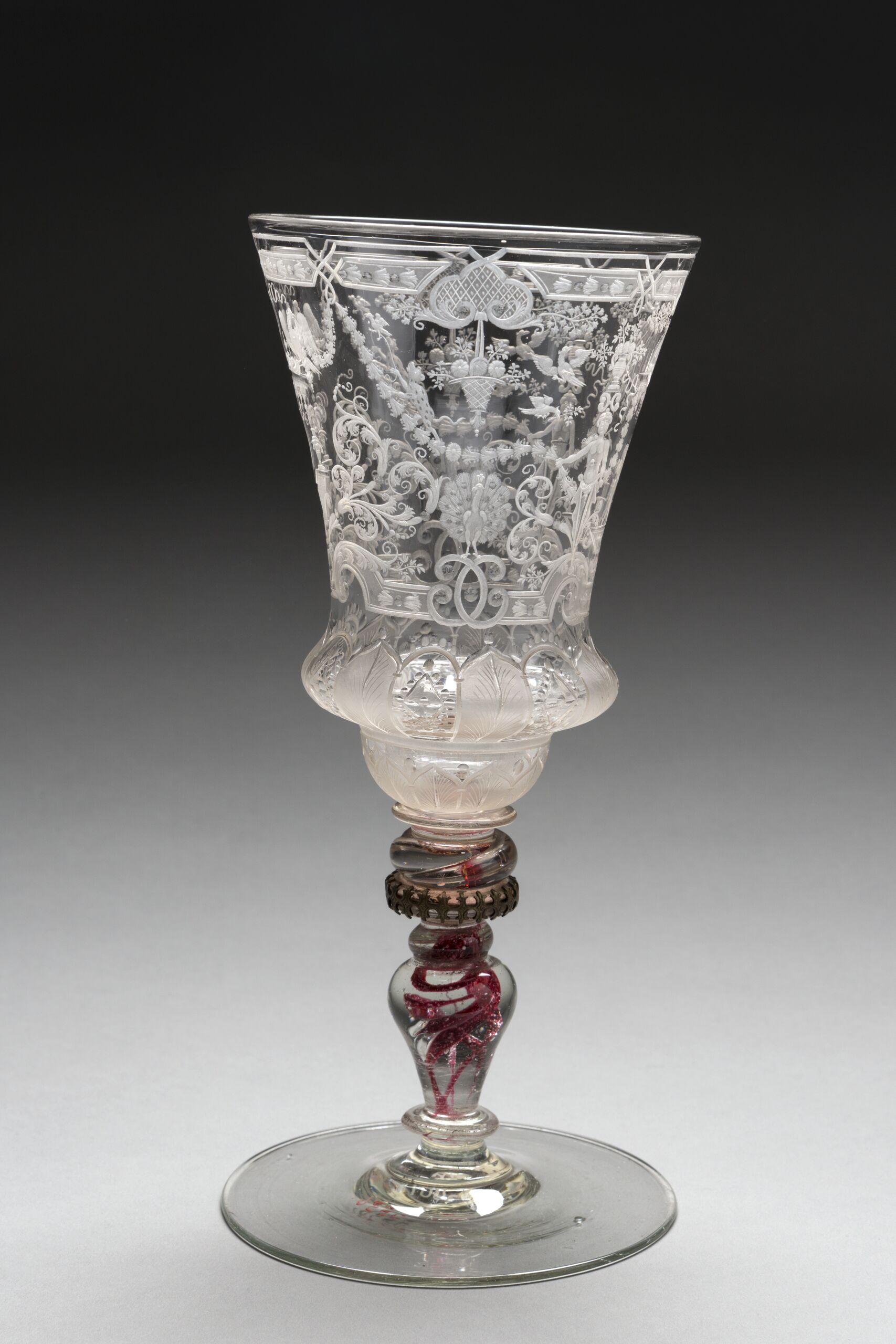 geschnitten, auf der Kuppa Laub- und Bandelwerkgrotesken, Baldachin, Amoretten beim Herzschmieden, Karyatiden, Vögel, Girlanden u.a. Am Kuppawulst ein Blattfries, Schaftfragment, gedrehterNodus mit Gold- und Rubinfäden, der übrige Schaft und der Fuss sind ergänzt