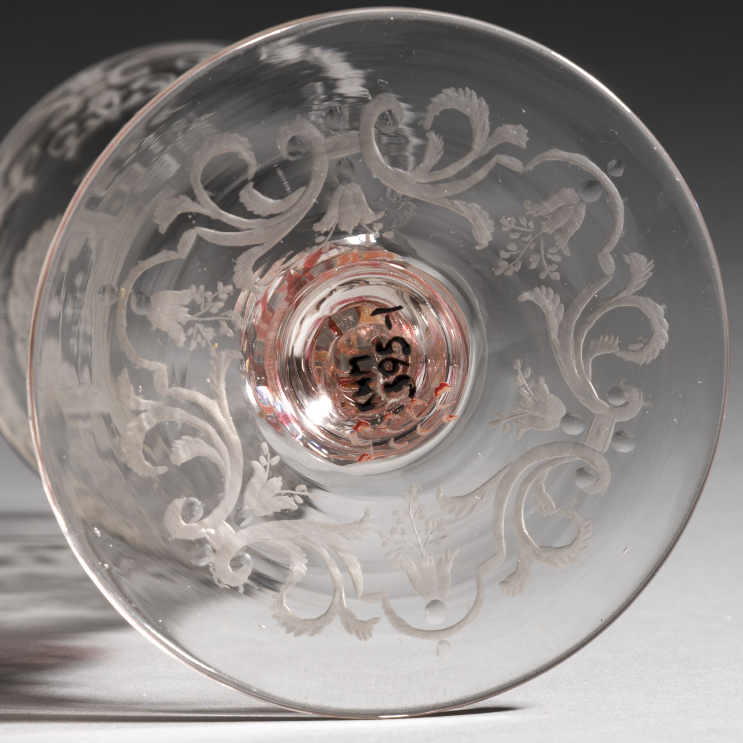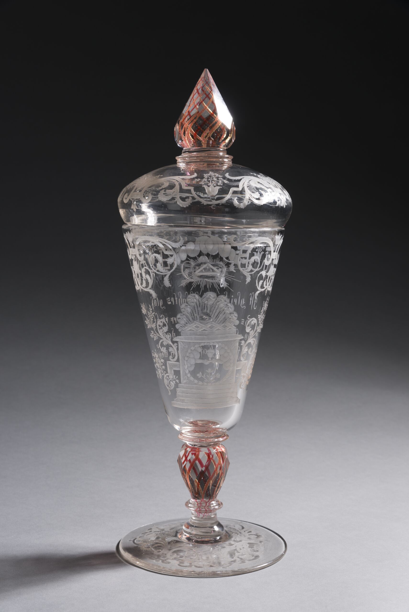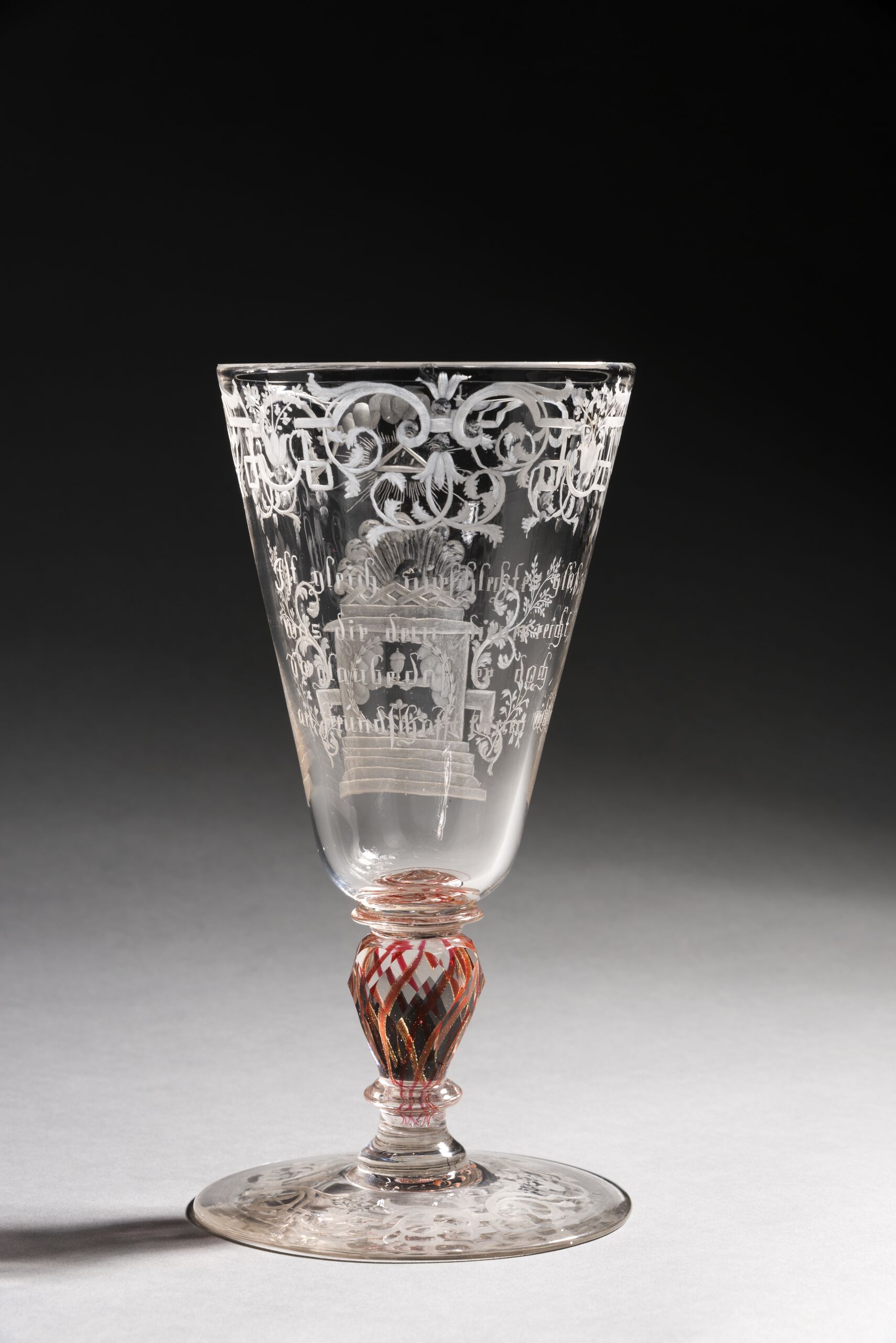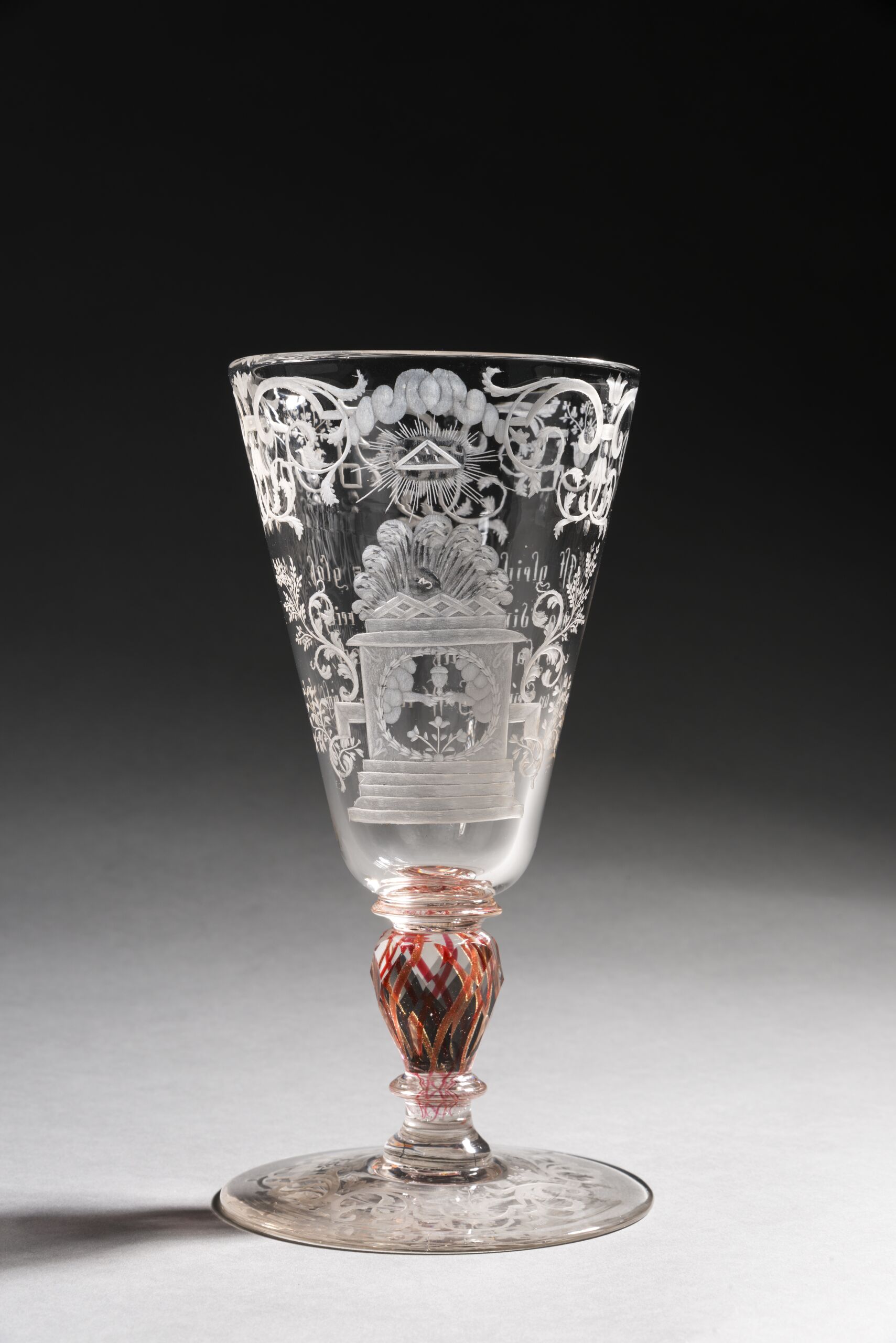 geschnitten. Altar mit Treuesymbolen, der Spruch: “Ist gleich nur schlechtes Glas, was dir dein Diener reicht, so glaube dass er doch an Freundschaft keinem weicht”. Am Mundrand Laub- und Bandelwerkfries; fas. Balusterschaft mit Rubin- und Goldfäden, am Fuss- und Laub- und Bandelwerk