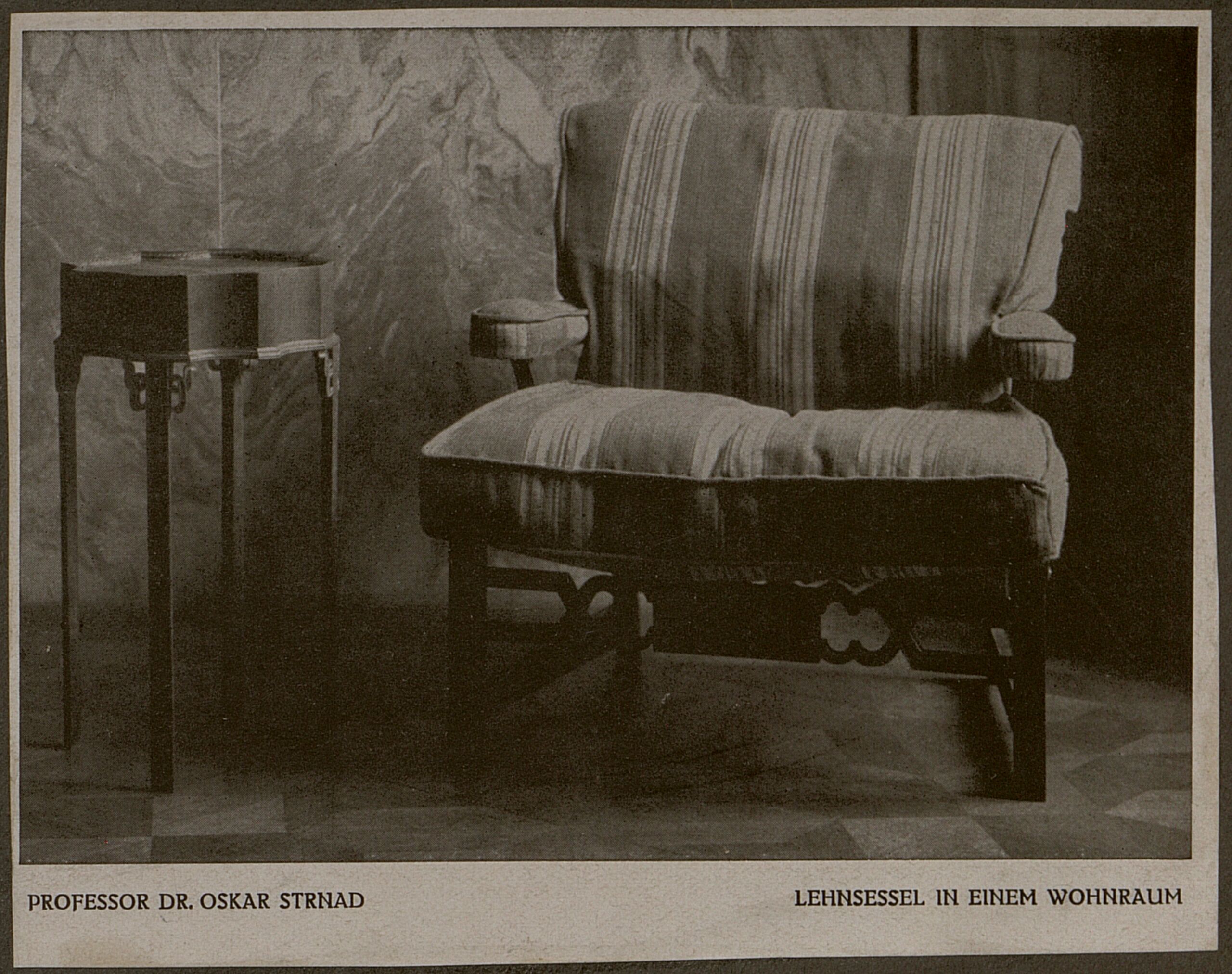 - Text am Objekt (Vorderseite, unten mittig) : PROFESSOR DR. OSKAR STRNAD LEHNSESSEL IN EINEM WOHNRAUM