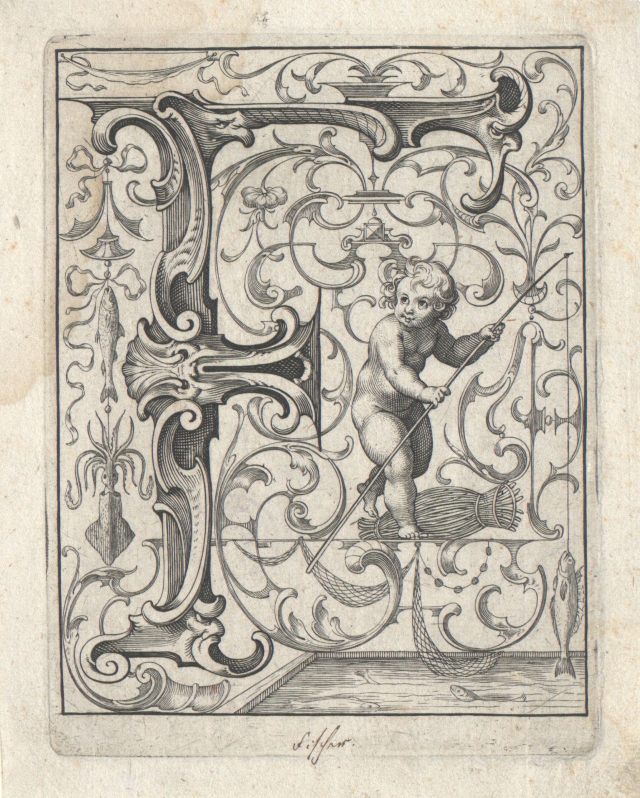 type specimens (documents), Der Buchstabe F mit einem Putto als Fischer, Blatt aus der Folge „Newes ABC Buechlein inventirt und in Kupffer gestochen von Luca Kilian Burger zu Augsburg”, gewidmet dem Goldschmied Melchior Gelb, Lucas Kilian, MAK Inv.nr. KI 1-161-7