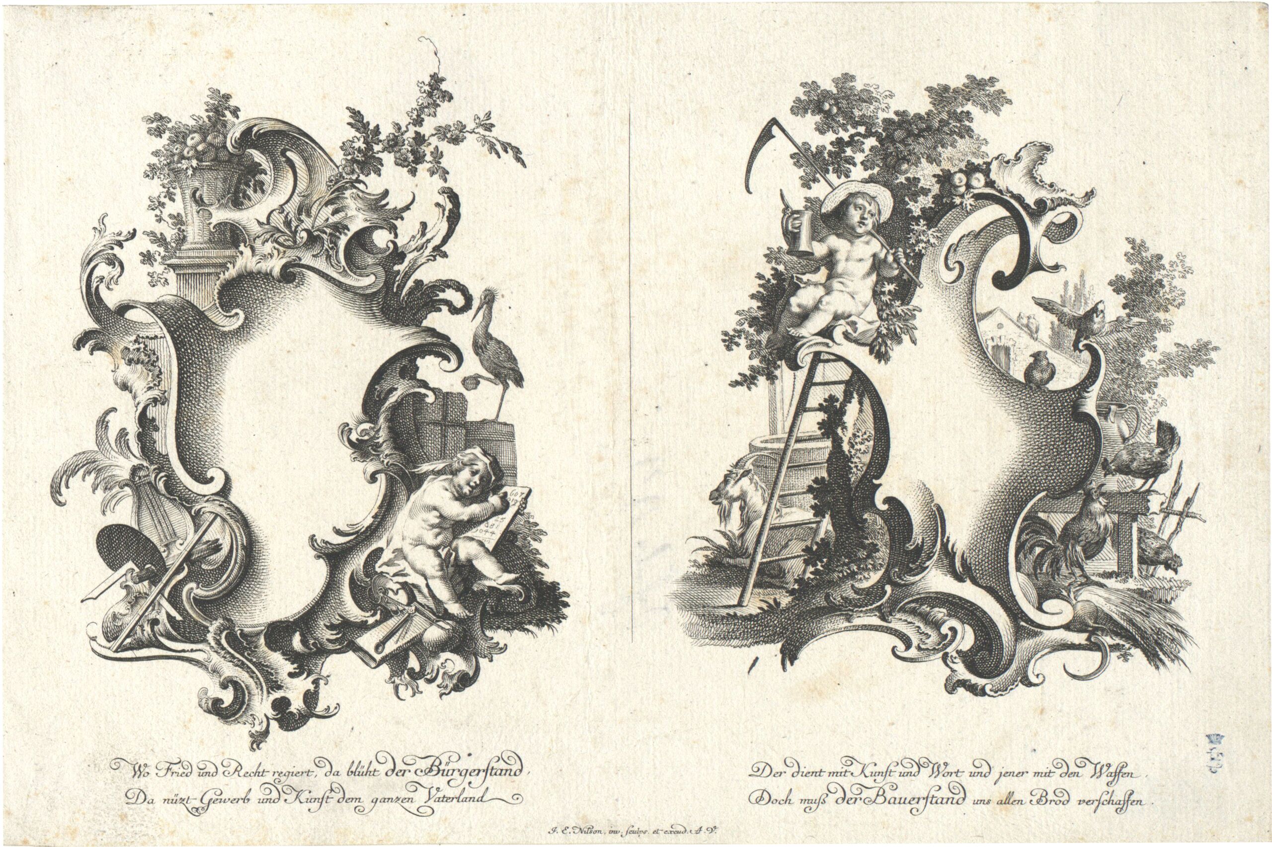 ornamental engraving, Der Gewerbestand und der Bauernstand, Blatt aus der Folge der vier Stände, herausgegeben von J. E. Nilson, Verlagsnummer XI (11. Folge des von Nilson verlegten Reihenwerks mit 69 Folgen), Johannes Esaias Nilson, MAK Inv.nr. KI 4028-2