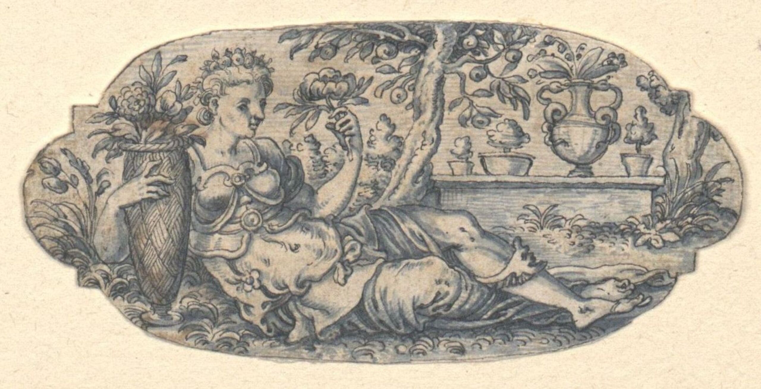 Entwurf für Monatsbild mit weiblicher Symbolfigur für den Mai. Blatt in Kartuschenform.