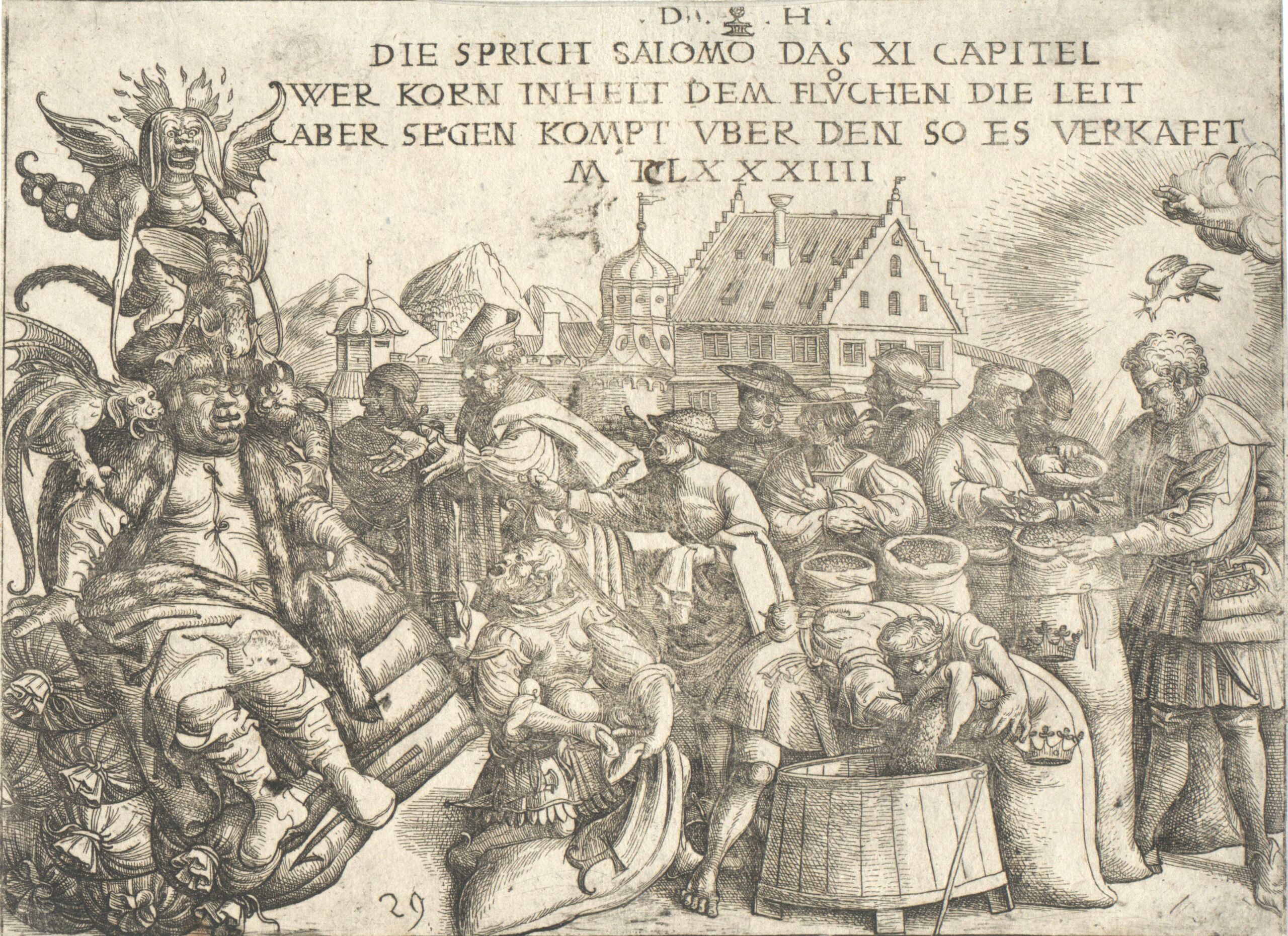 Druckgrafik, Der Wucherer. Darstellung des Spruches Salomons: “Wer Korn inhelt dem fluchen die Leit ...”, mit Funck- Nummer 29, Daniel Hopfer, MAK Inv.nr. KI 946