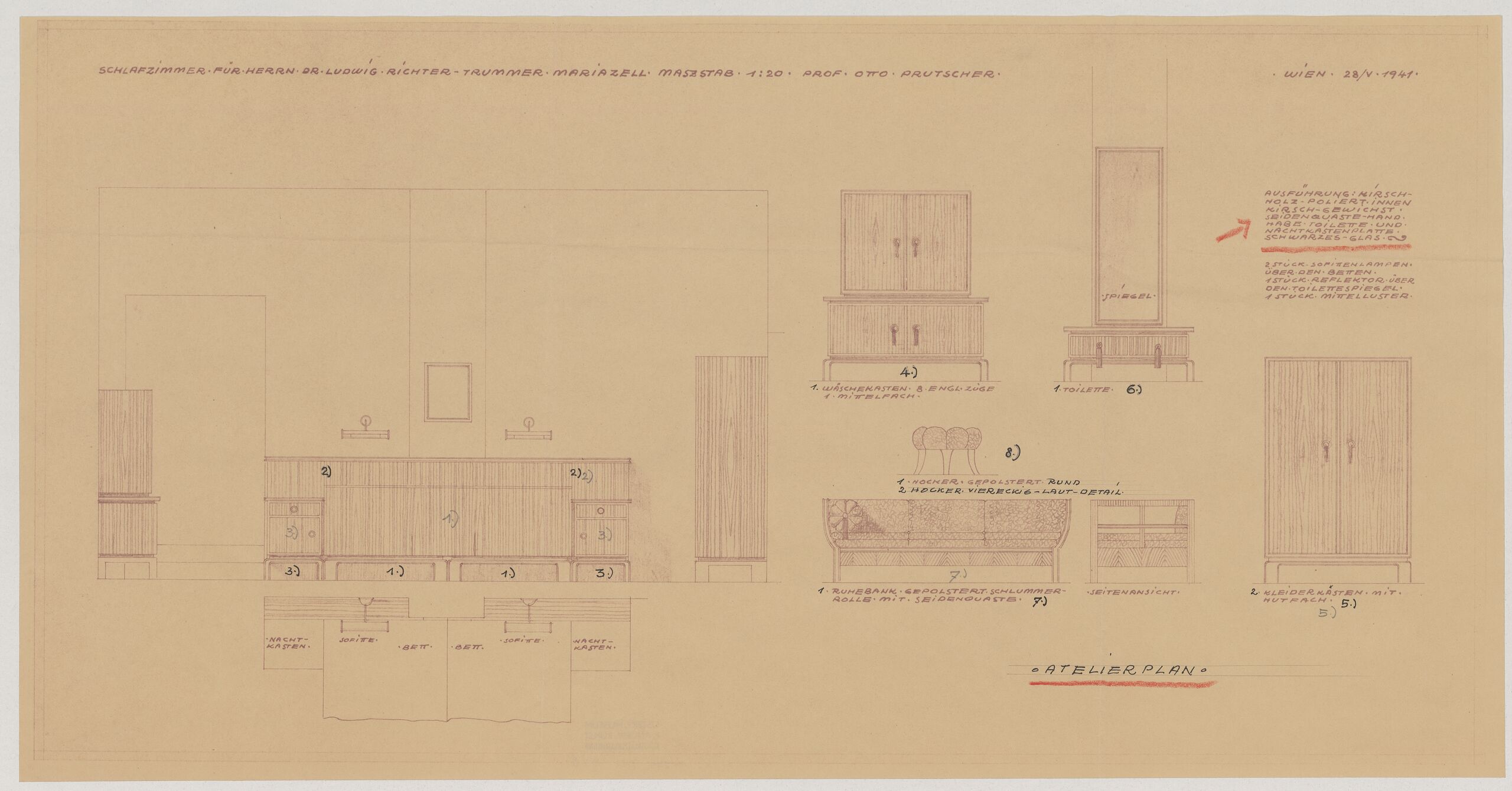 - text on object (Vorderseite, links oben) : SCHLAFZIMMER FÜR HERRN DR. LUDWIG RICHTER-TRUMMER MARIAZELL MASZSTAB 1:20 PROF. OTTO PRUTSCHER