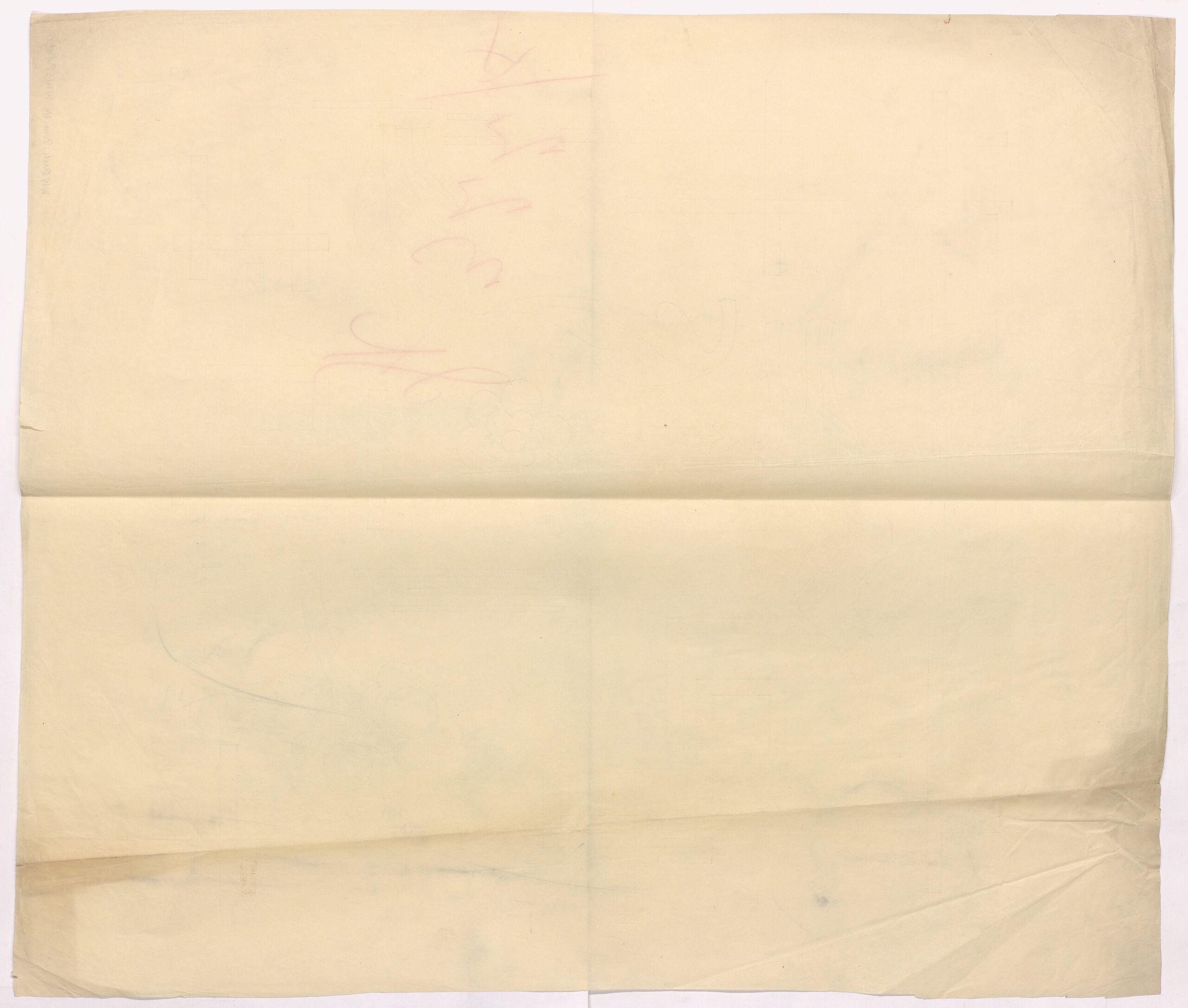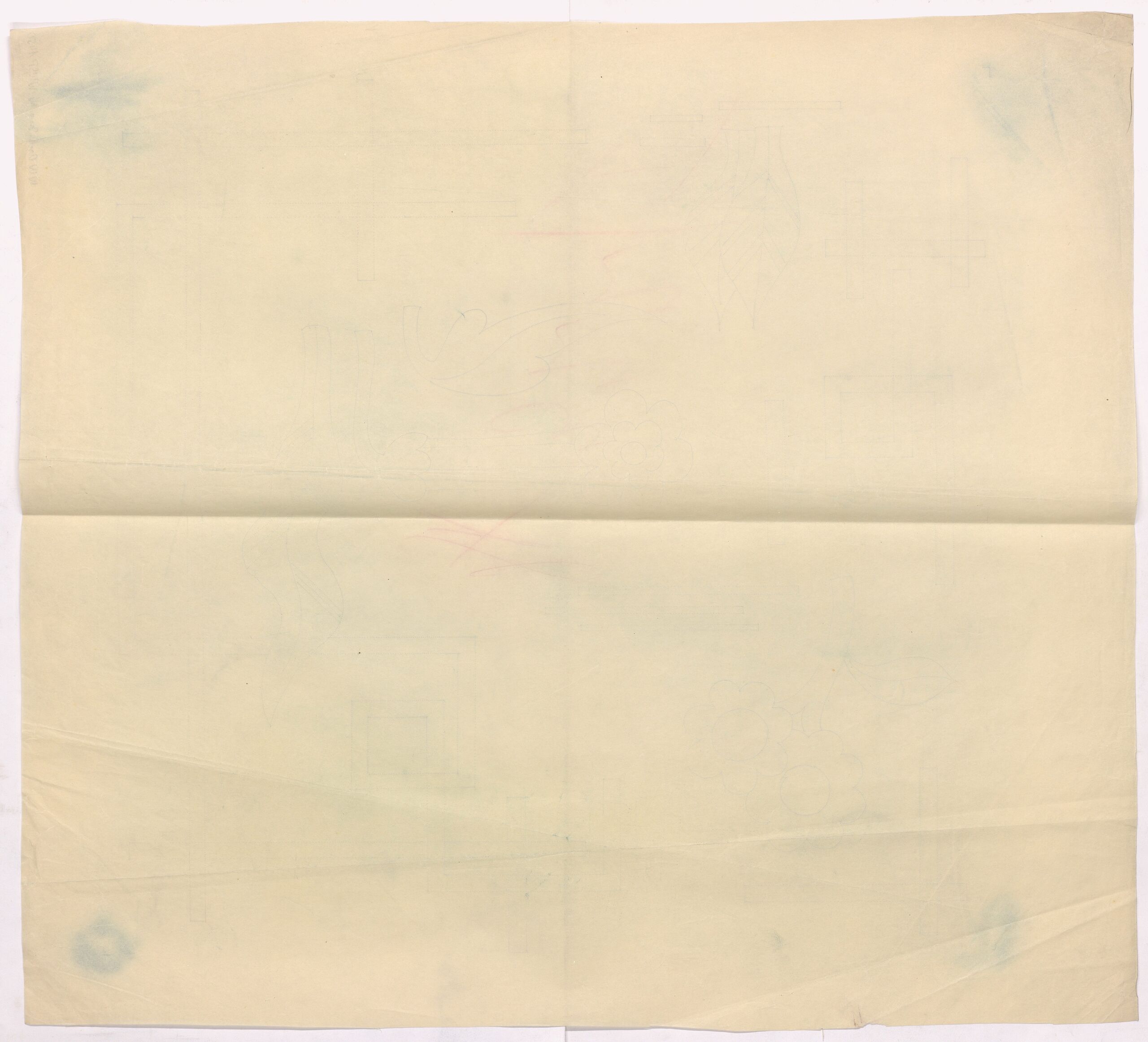 blueprint, Drei punktierte Pausen für einen quadratischen Polster (Kissen) mit Balken und stilisierten Blumen, Anonym, MAK Inv.nr. WWSP 1450