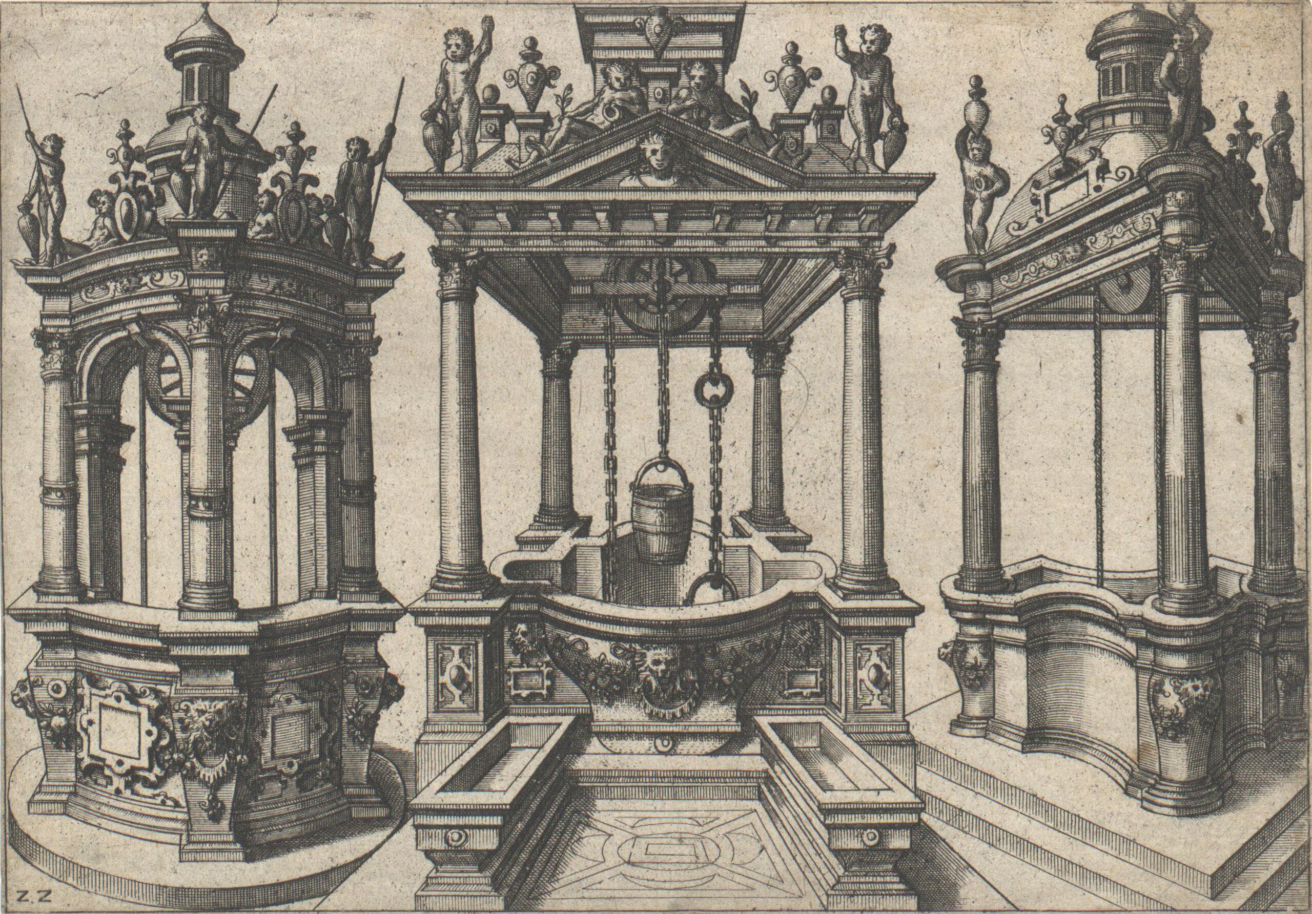 architectural rendering, Drei Ziehbrunnen, Blatt 22 aus der Folge der kleinen Brunnen, herausgegeben von Ph. Galle, Hans Vredeman de Vries, MAK Inv.nr. KI 1-955-37