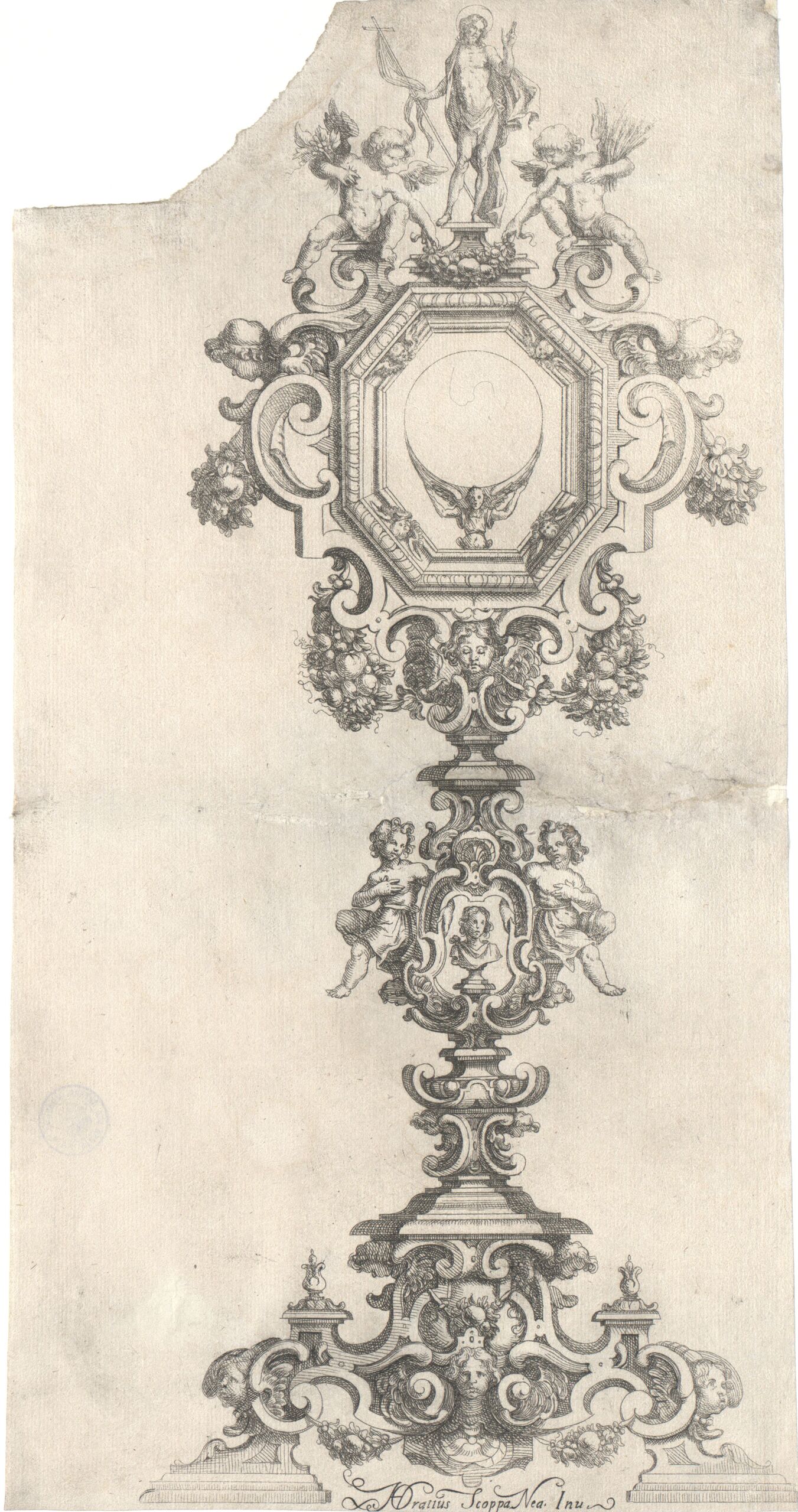 ornamental engraving, Ein Ostensorium (Monstranz), Blatt 13 aus einer Melchior Borgia gewidmeten Folge von Gefäßen und Geräten, Orazio Scoppa, MAK Inv.nr. KI 2329-9