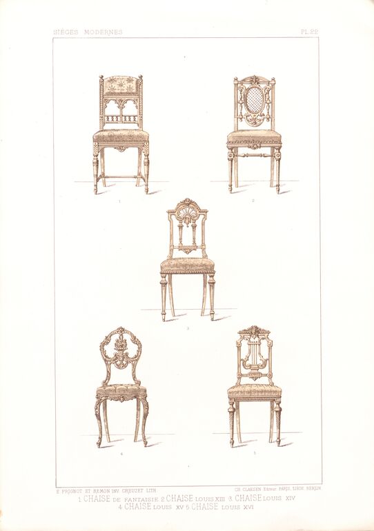 - text on object: SIÉGES MODERNES PL 11 / CANAPÉ STYLE LOUIS XVI / E. PRIGNOT ET REMON INV. CREUZET LITH / CH CLAESSEN Editeur PARIS, LIÉGE, BERLIN