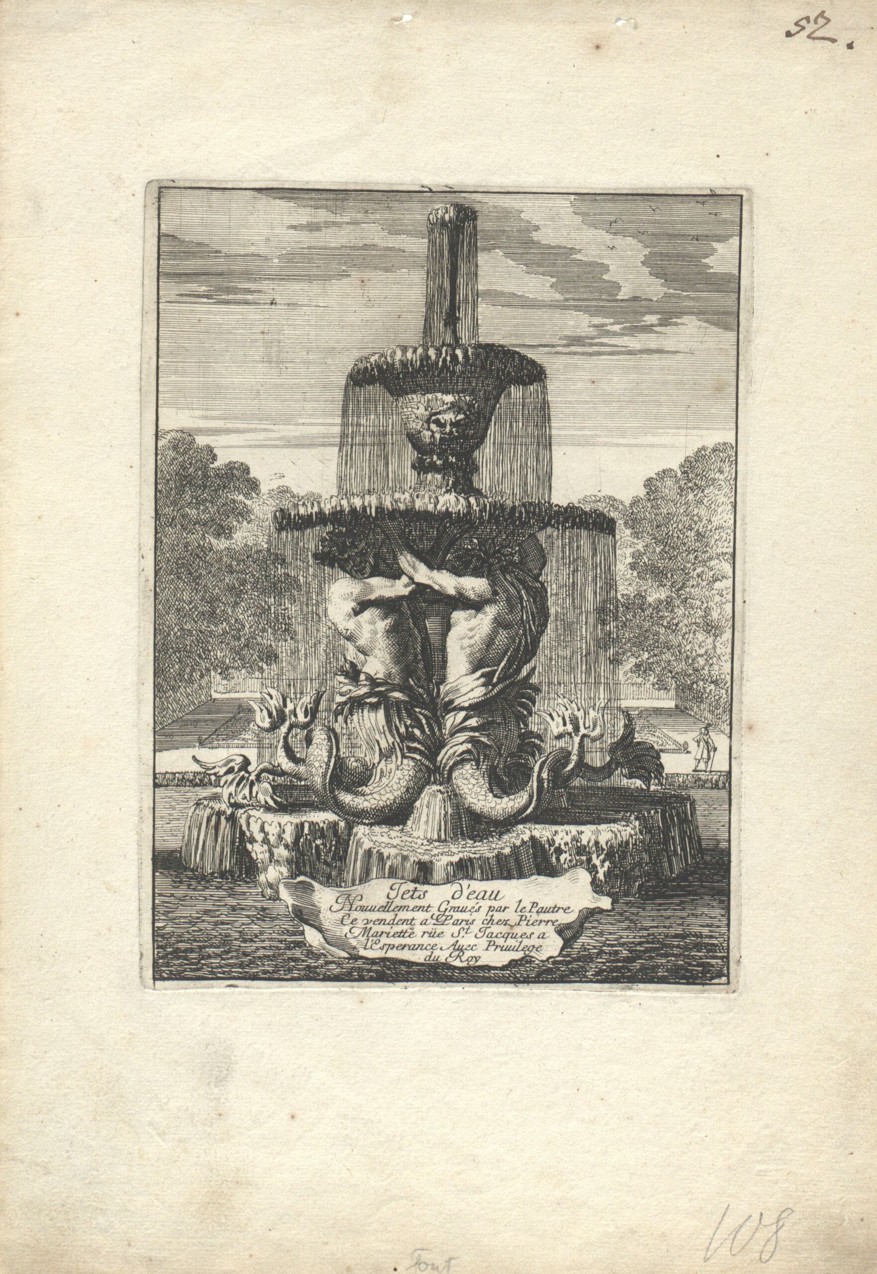 - text on object: Jets d‘ eau/ Nouvellement Gravés par le Pautre/ Ce vendent a Paris chez Pierre/ Mariette rue S.t Jacques a/ l‘ Esperance Avec Privilege/ du Roy