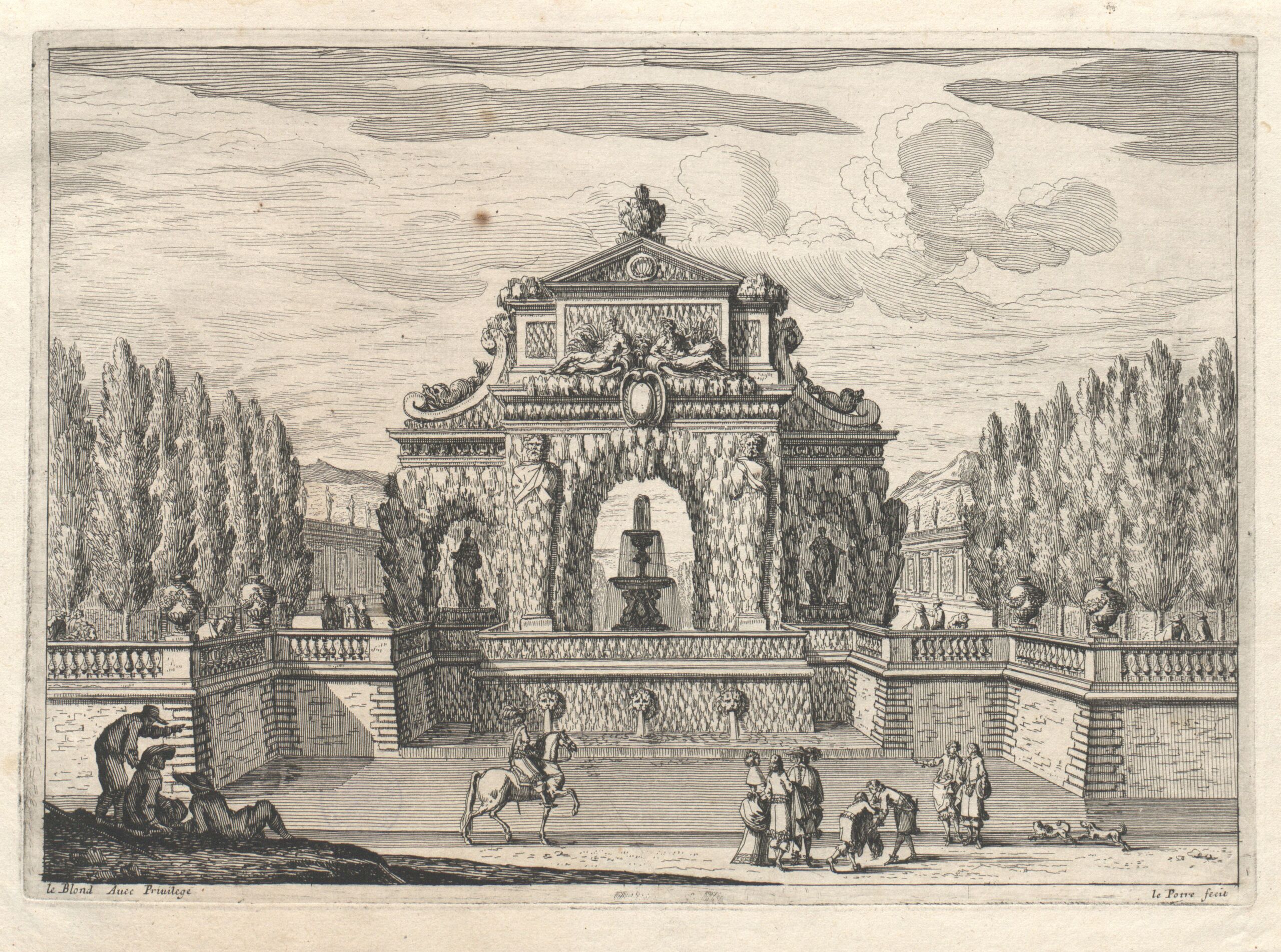 architectural rendering, Ein Springbrunnen und ein Wasserbassin in einem Schloßpark, Jean Lepautre, MAK Inv.nr. KI 1-658-453