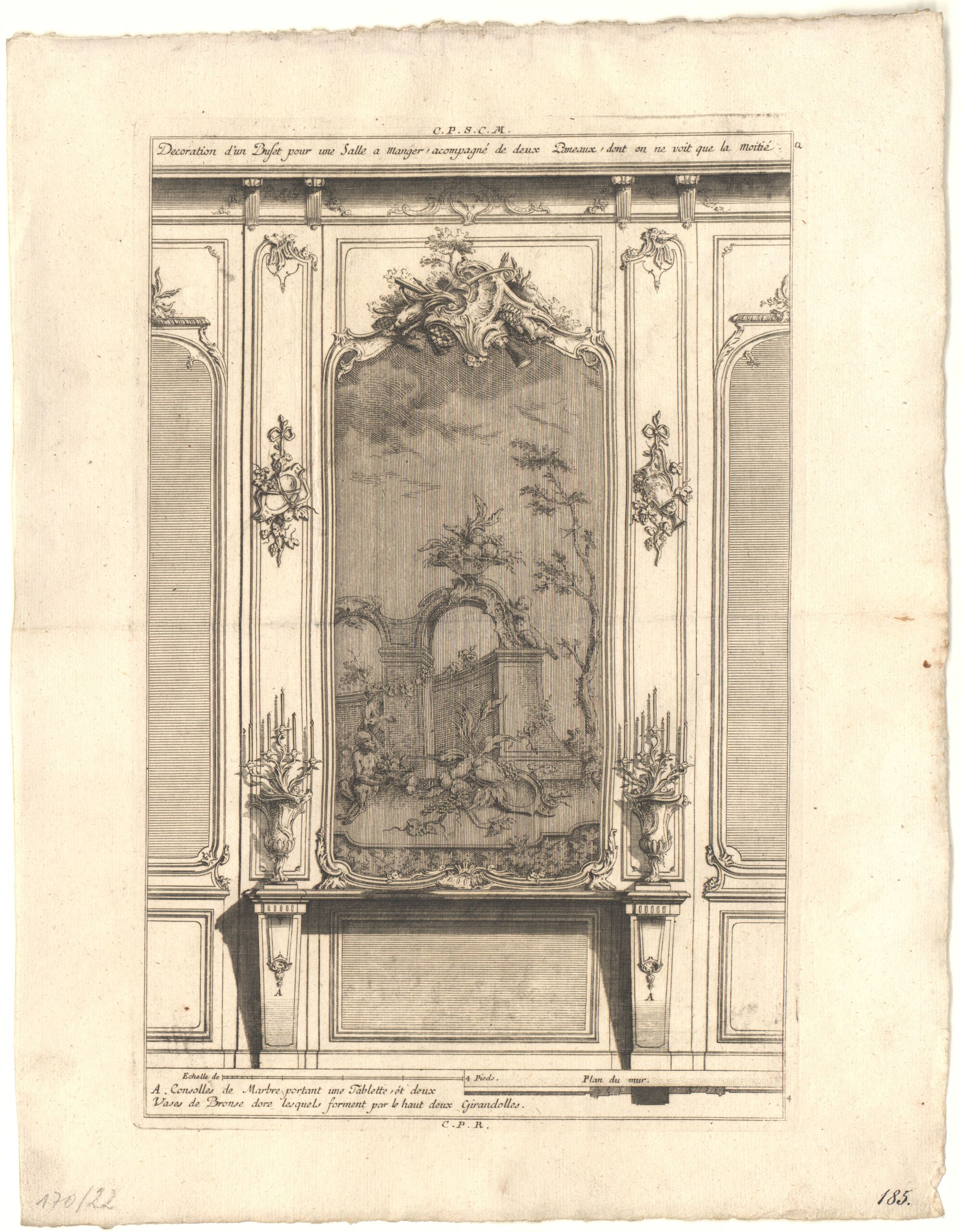 - text on object: C.P.S.C.M. / Decoration d‘ une Bufet pour une Salle a Manger, acompagné de deux Paneaux, dont on ne voit que le Moité. / .... / Q 4