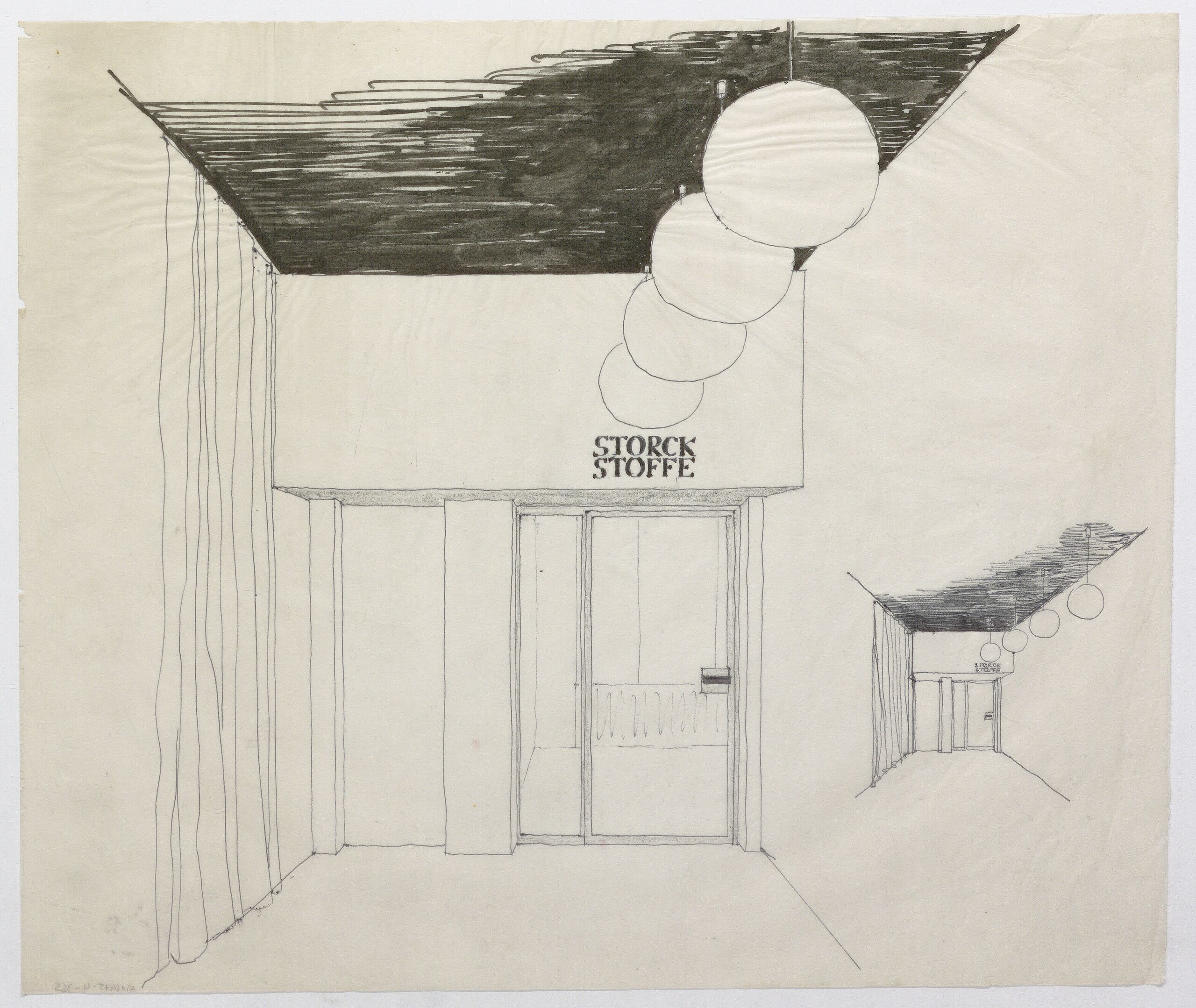 design drawing, Eingangsbereich mit vier Lampen und dem Firmenschild, Anna-Lülja Praun, MAK Inv.nr. KI 16475-4-365