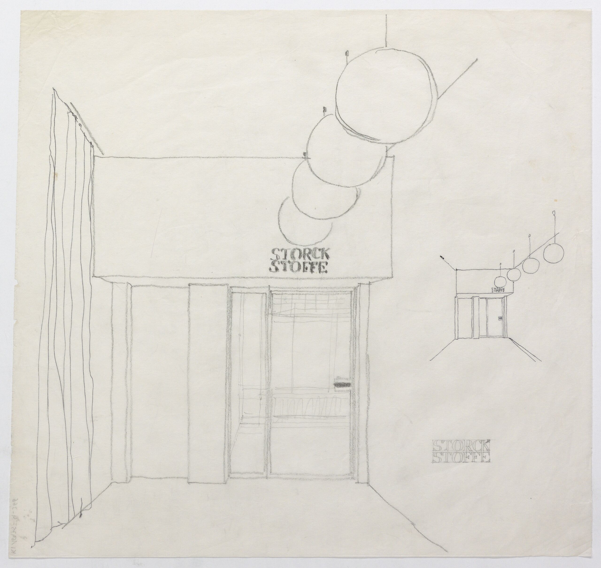 design drawing, Eingangsbereich mit vier Lampen und dem Firmenschild, Anna-Lülja Praun, MAK Inv.nr. KI 16475-4-366