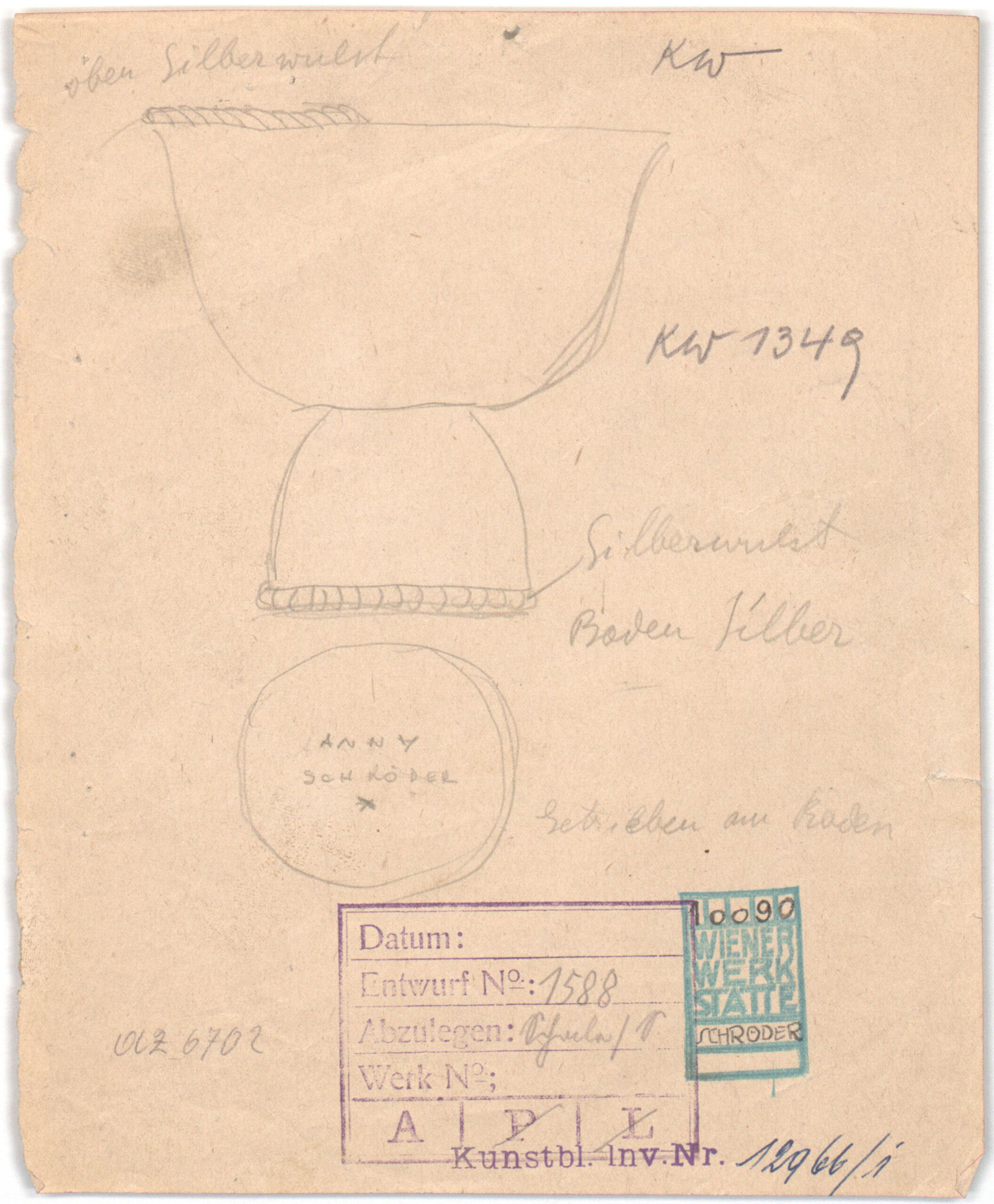 - text on object: oben Silberwuls/unten: Silberwuls/Boden Silber/Getrieben am Boden/Boden: Anny SchröderSilberwulst, Boden Silber