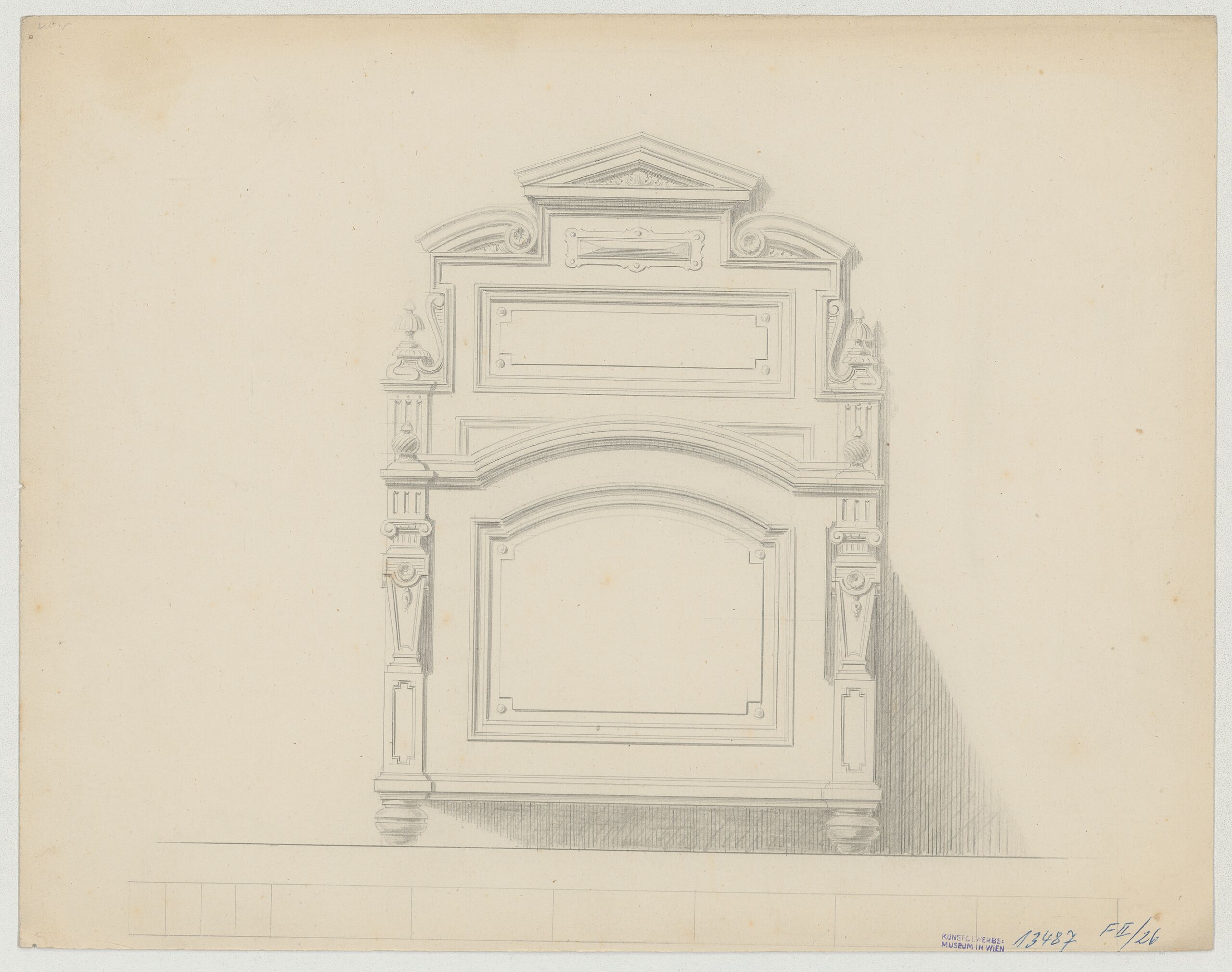 - Entwurf für ein Bettgestell mit plastisch architektonischem Aufbau und antikisierenden Formelementen, wie Säulen, Triglyphen, Voluten und einem Dreiecksgiebel als Bekrönung des Kopfteils, sowie belschlagwerksartigen Dekorelementen am Kopf- und am Fußteil (descriptive title)