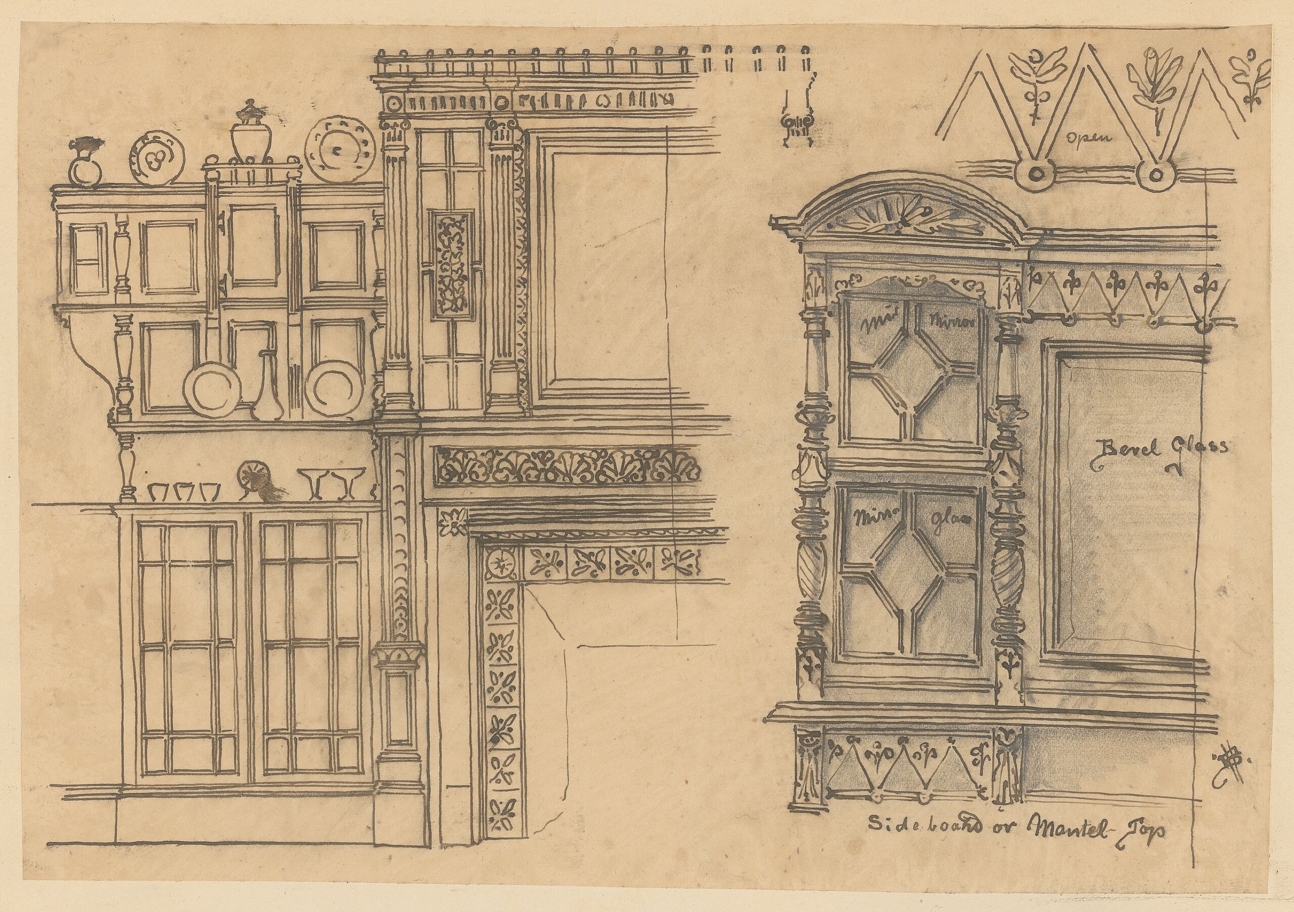 - Entwurf für eine Kamineinfassungen, mit Kacheln, einem Aufsatz mit zentraler Spiegelfläche, sowie einem seitlichem Schrank für Geschirr und für einen Kaminaufsatz mit zentraler Glasfläche, zwei seitlichen Regalfächern mit gedrechselten Pfosten, kassettierten und verspiegelten Flächen und einem abschließenden Segmentbogen (descriptive title)