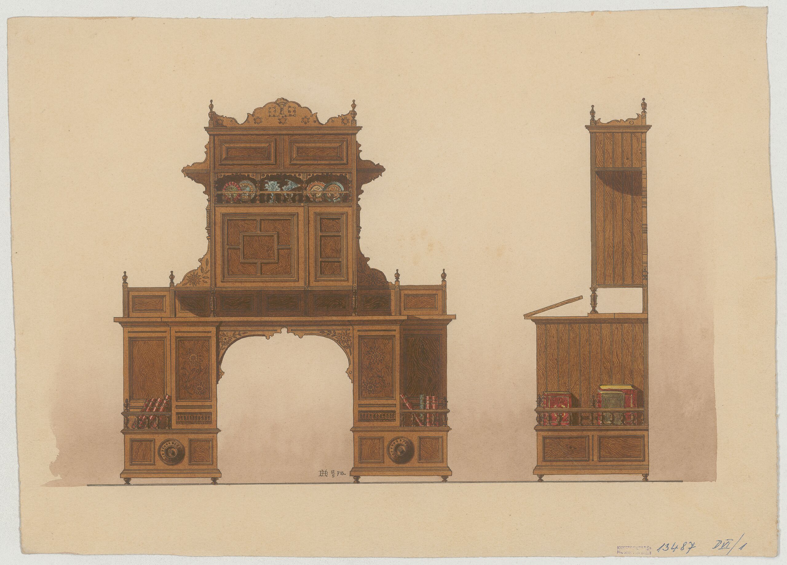 furniture design, Entwurf für einen Aufsatzschreibtisch in Vorder- und Seitenansicht mit aufklappbarer Tischplatte, einem Aufsatzschrank mit Bekrönung, mehreren Kästen, einem Regalfach mit Zierbalustrade sowie zwei seitlichen Bücherfächern die ebenfalls von einer Zierbalustrade begrenzt werden, Heinrich Hof-Tapezierer Backé, MAK Inv.nr. KI 13487-4-6-1