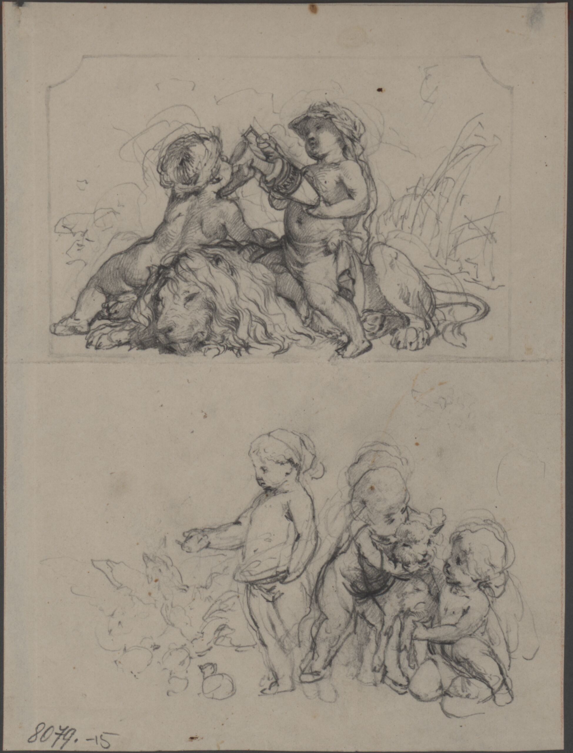 Entwurf für zwei Wanddekorationen mit Putten. Oben zwei Putten mit einem Löwen sowie unten zwei weitere mit Lamm und Hühnern.