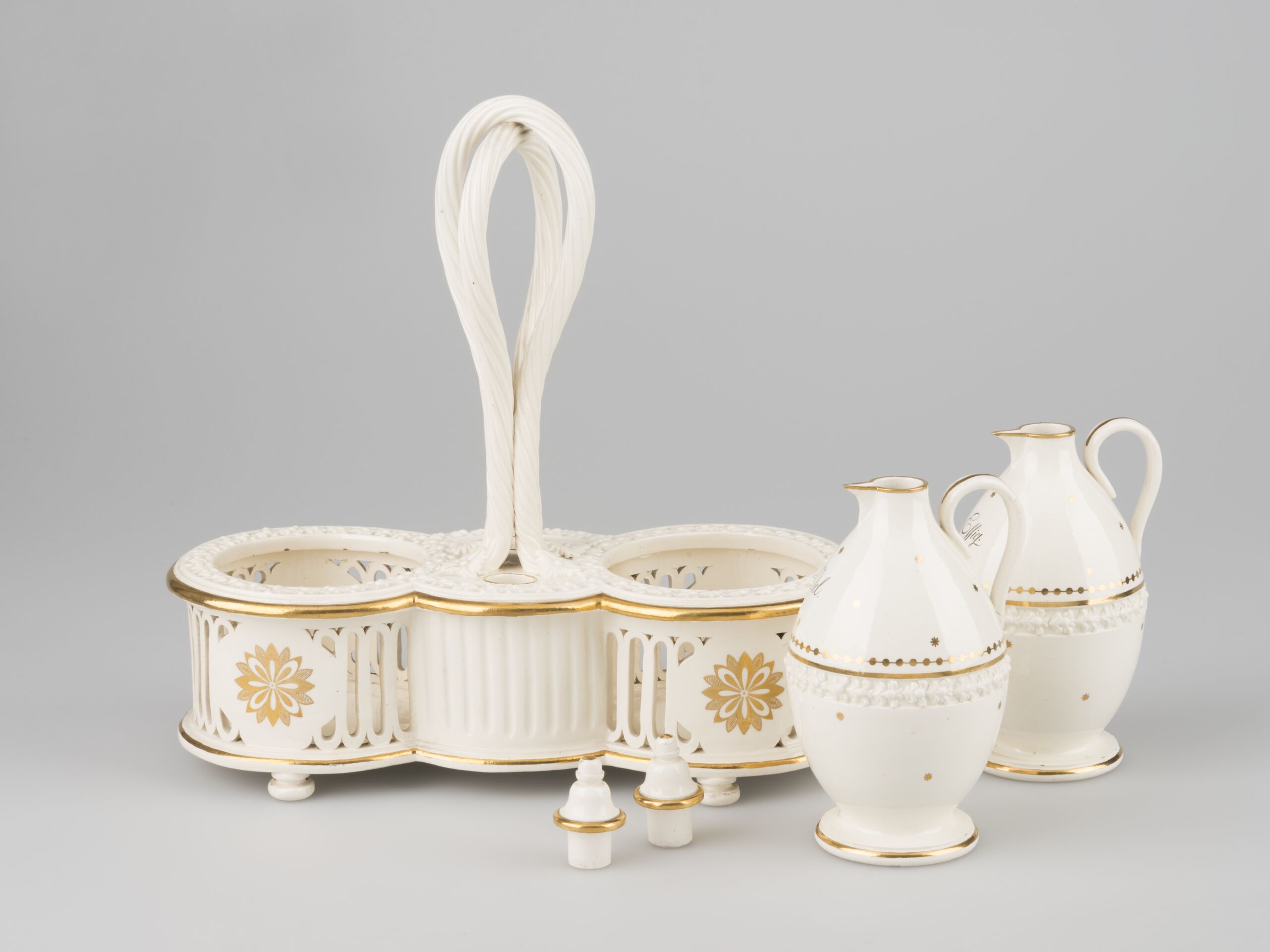 Essig-Öl-Menage: "Fein weißes Service" für Essig und Öl, reliefiert, Durchbruchsarbeit, gedrehter Henkel, Goldränder und Golddekor