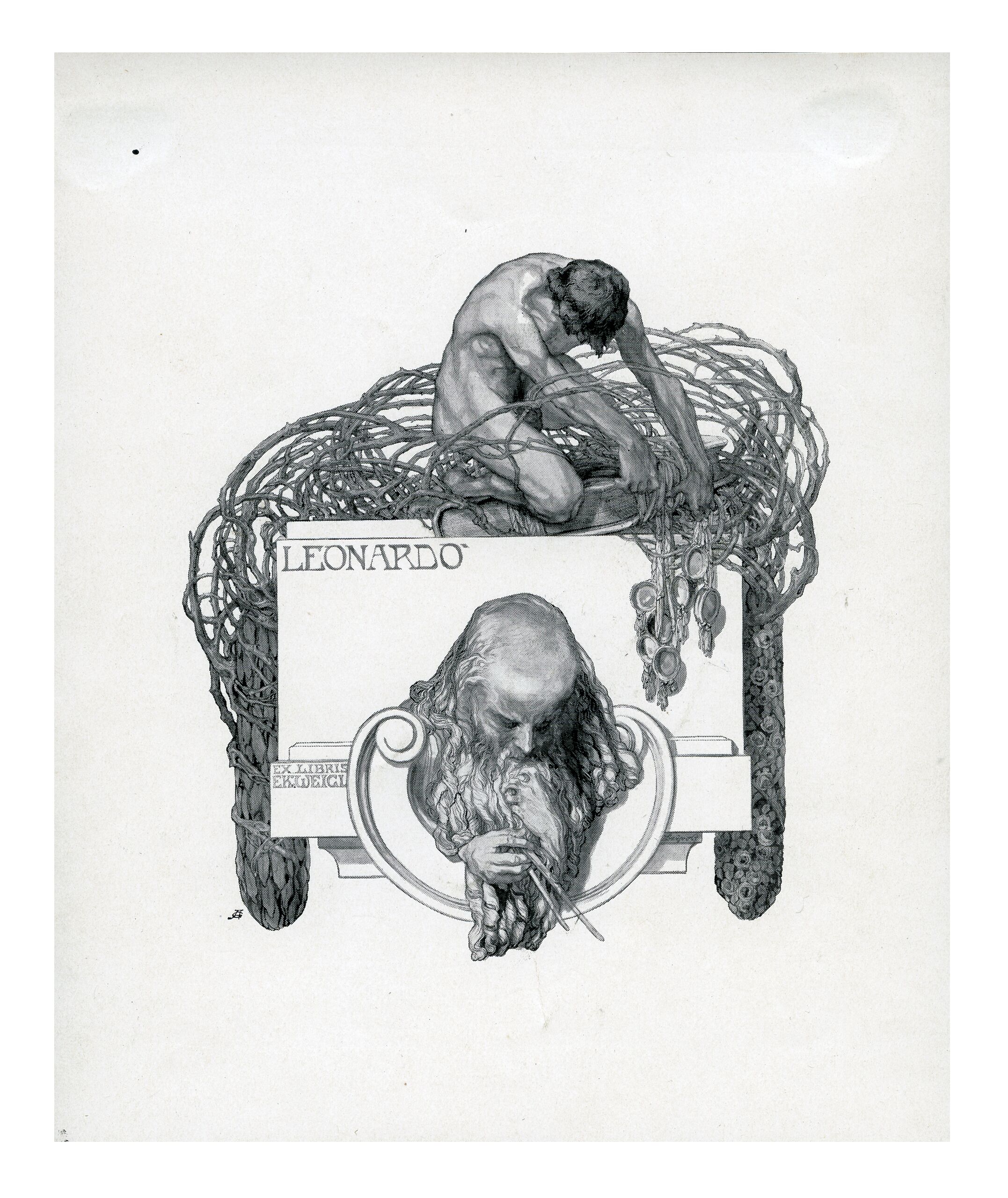 - text on object: "LEONARDO" sowie "EX:LIBRIS / EKWEIGL"; Monogramm "AG" (ligiert) des Druckers / der Druckerei unten links.