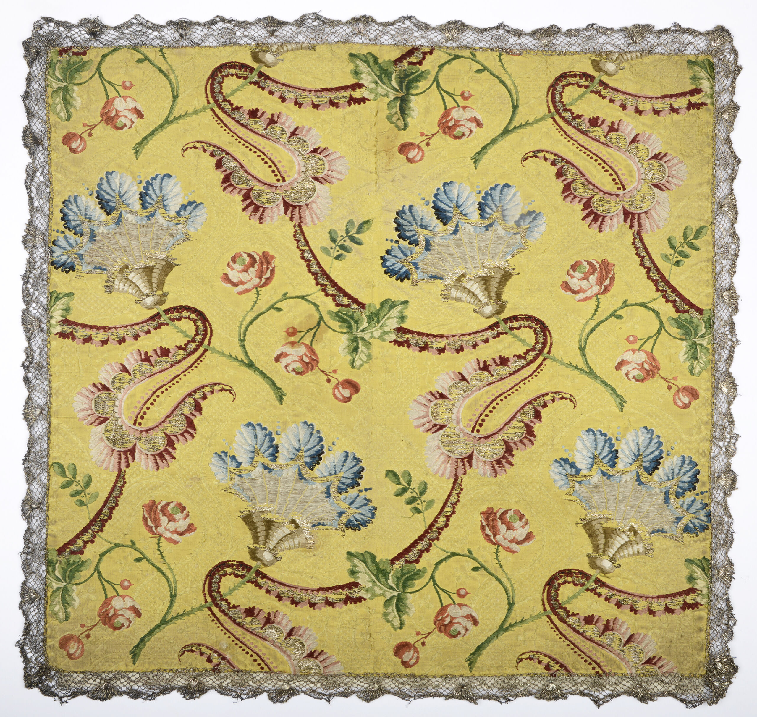 chalice veil, Federbuschen und Rosen mit geschwungenem rot/goldenem Spitzenband, Anonym, MAK Inv.nr. T 7917