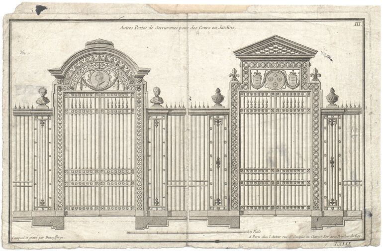 - text on object: Developpement d‘ une Fenetre Corintienne / Composé et gravé par Deneufforge / A Paris chez l‘ Auteur rue S.t Jacques au Chariot d‘ or avec Privilege du Roy. / 3. 549