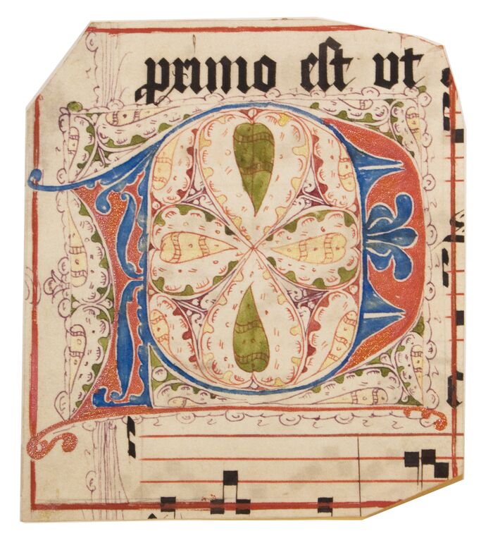 Teil eines Blattes einer Missale mit Filigraninitiale des Buchstabens "R". Darüber und darunter wechseln Textur und Notation die Zeilen, wobei es sich um Hufnagelschrift auf fünf Linien handelt. Das Recto trägt eine Filigraninitiale mit Akanthusrankenwerk in Rot und Grün, während sich in der Randleiste schlichter Fleuronnéeschmuck fortsetzt.