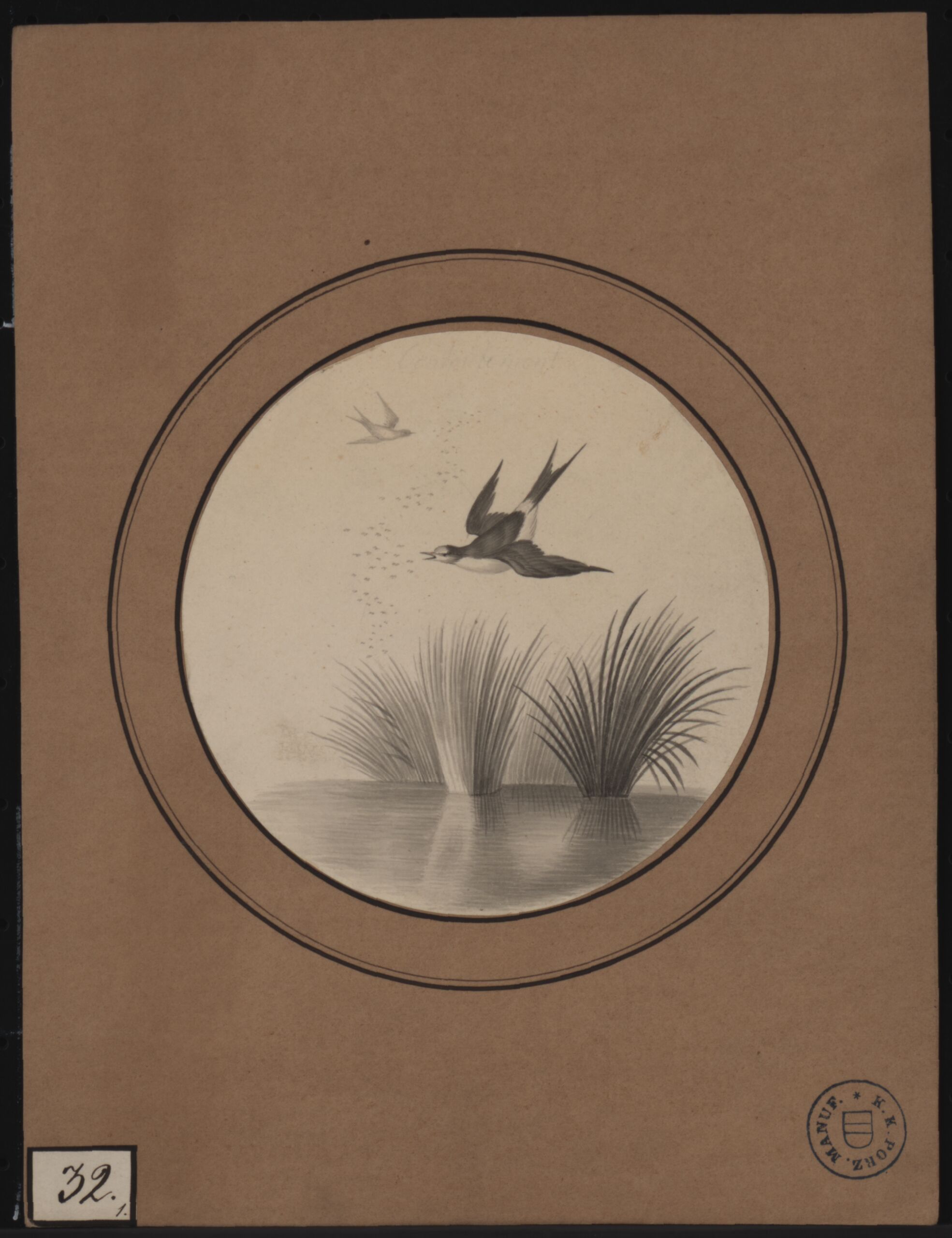 - plate mark: aufgeklebte Marke: 32.1. [Feder in Schwarz]