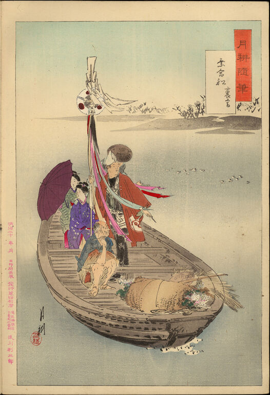 Blatt aus einem Album mit zwei Serien von Gekkō, eine über schöne Frauen und Blumen und eine zweite über japanische Legenden und Helden. Hier ein Blatt aus der Legenden-Serie. Ein Blumenverkäufer kniet zwischen zwei Regalen mit diversen Pflanzen. Darunter Zweige von Ginkgobäumen (ichō), Kamelien (tsubaki),... Die Frau davor kauft Blumen für ein Gesteck. Hinter der Säule eine zweite Frau mit einem kleinen Kind auf dem Arm.