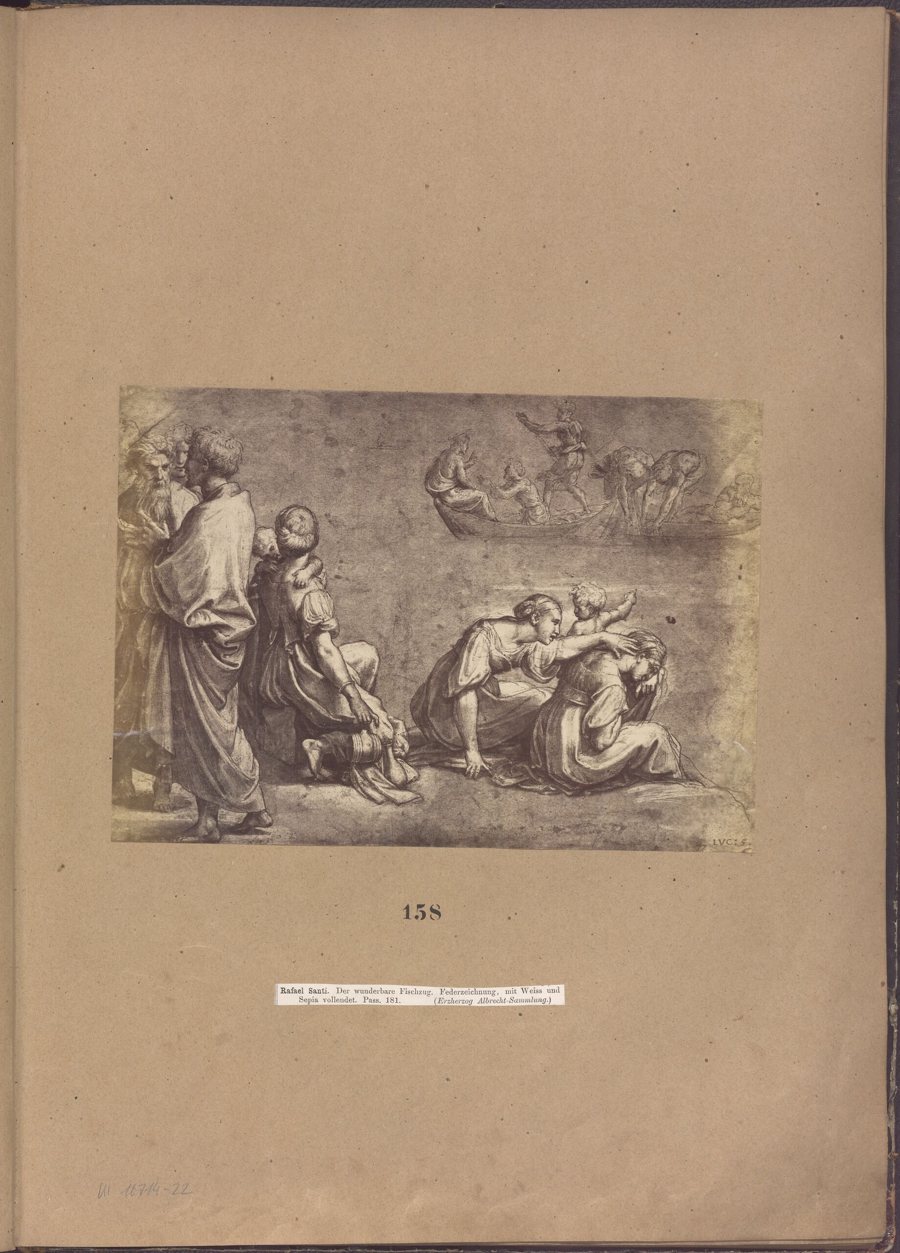 - text on object: Rafael Santi. Der wunderbare Fischzug. Federzeichnung, mit Weiss und / Sepia vollendet. Pass. 181. (Erzherzog Albrecht-Sammlung.)