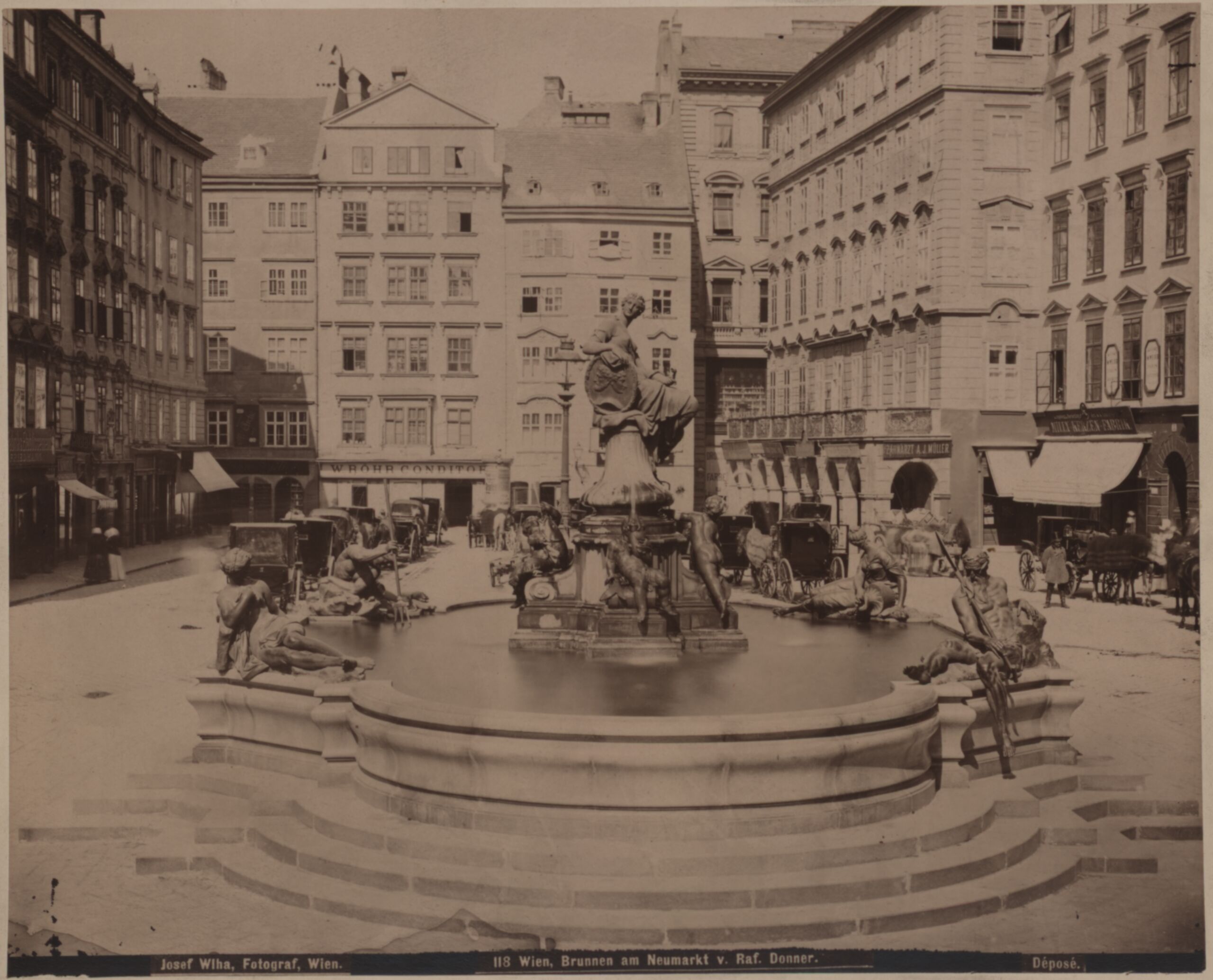 - text on object (rechts unten) : Josef Wlha, Fotograf, Wien. / 118 Wien, Brunnen am Neumarkt v. Raf. Donner. / Déposé.