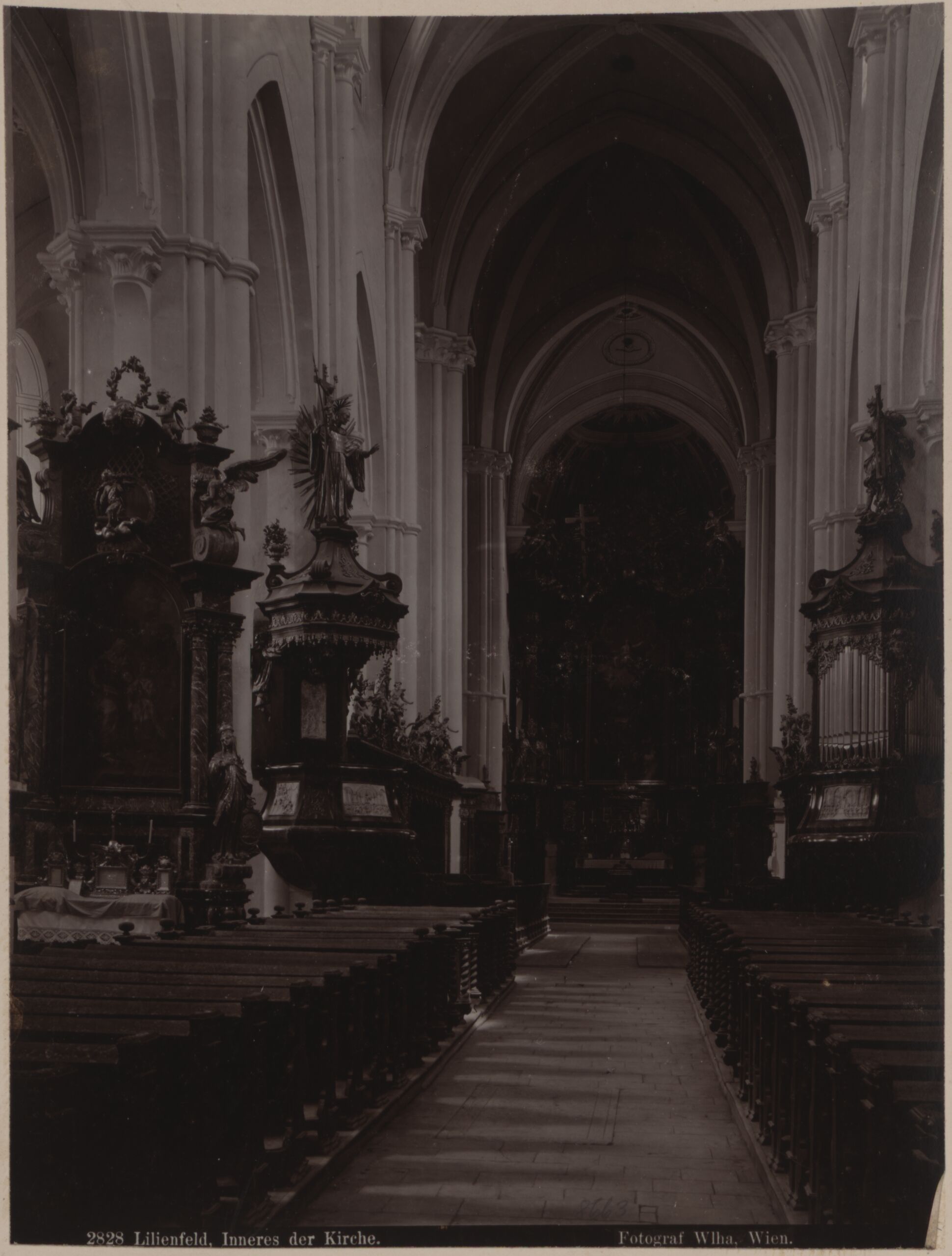 - text on object (unten) : 2828 Lilienfeld, Inneres der Kirche. / Fotograf Wlha, Wien.