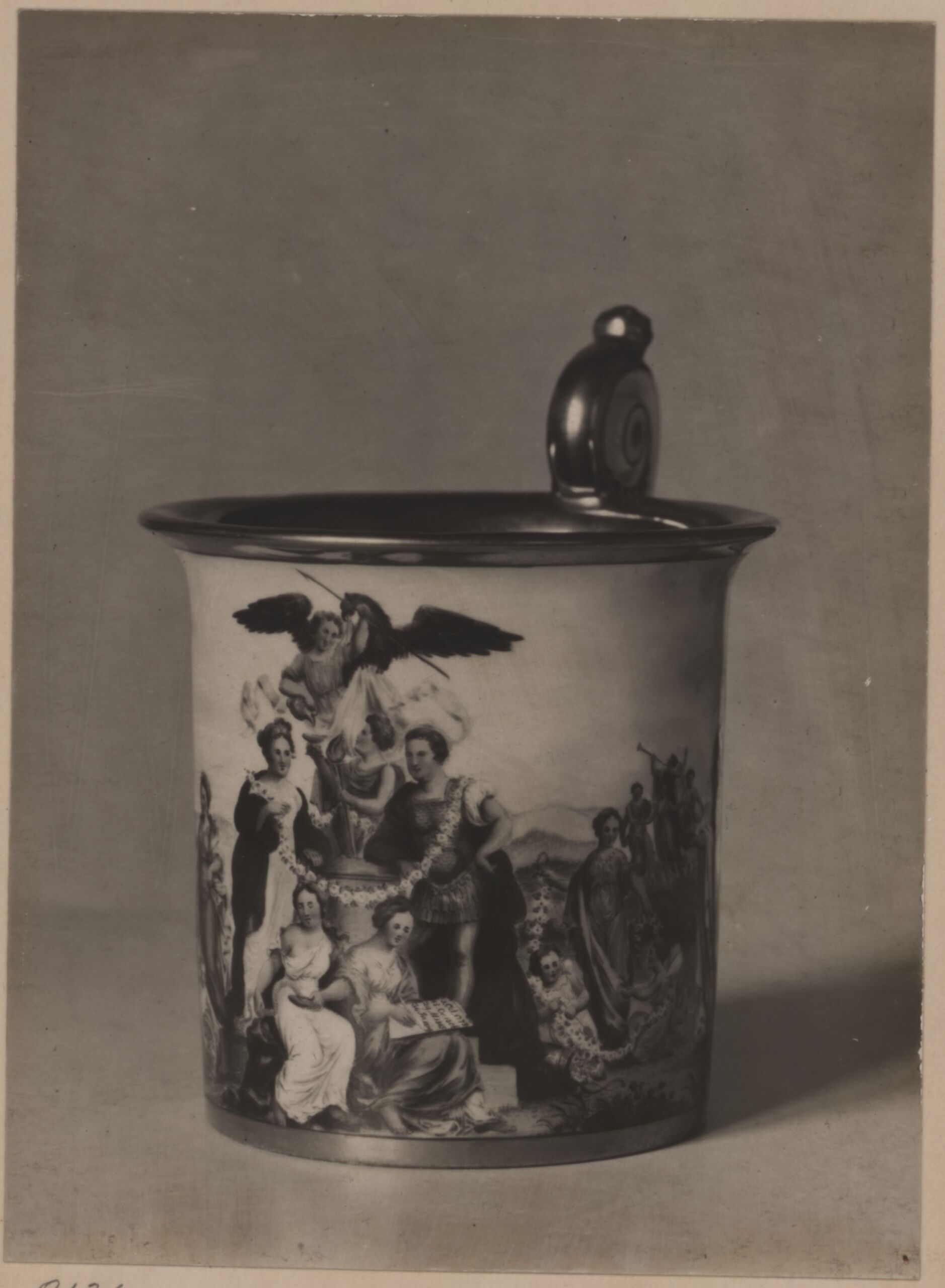 - text on object: [Untersatzkarton, rechts unten]: Tasse (Berlin?), 1819, mit Karl August und / Louise von Sachsen-Weimar. Wien, Öst. Museum.[Untersatzkarton, links unten]: Wien, Österr. Museum f. K. u. I.