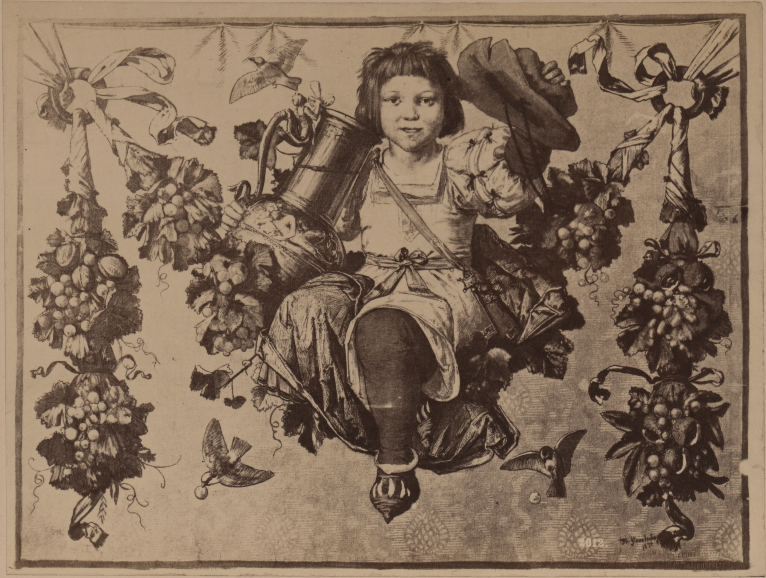 - Fotografie einer Malerei mit einer in einer Girlande hängenden Figur mit einem Krug in der Hand, von Friedrich Geselschap (given title)