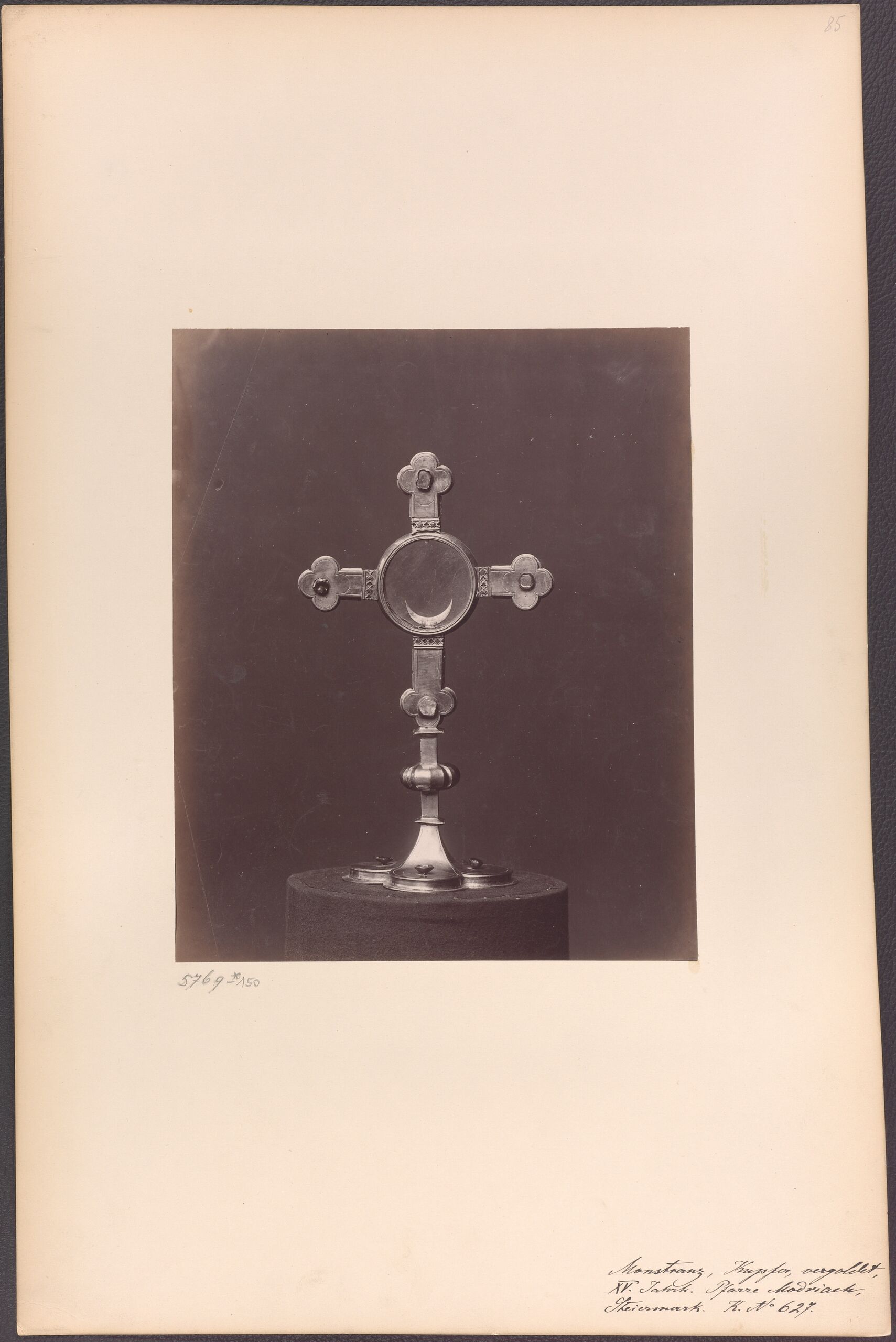 - text on object (Untersatzkarton, rechts unten) : Monstranz, Kupfer, vergoldet, / XV. Jahrh. Pfarre Madriach, / Steiermark. K. No. 627.