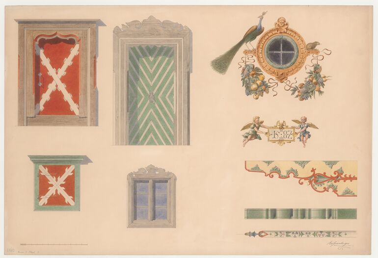 - text on object: [Untersatzkarton, links]: Schloß Tratzberg. [Karton]: Renaissancetruhe d. 16. Jhdts - / auf Schloss Tratzberg, Tirol.