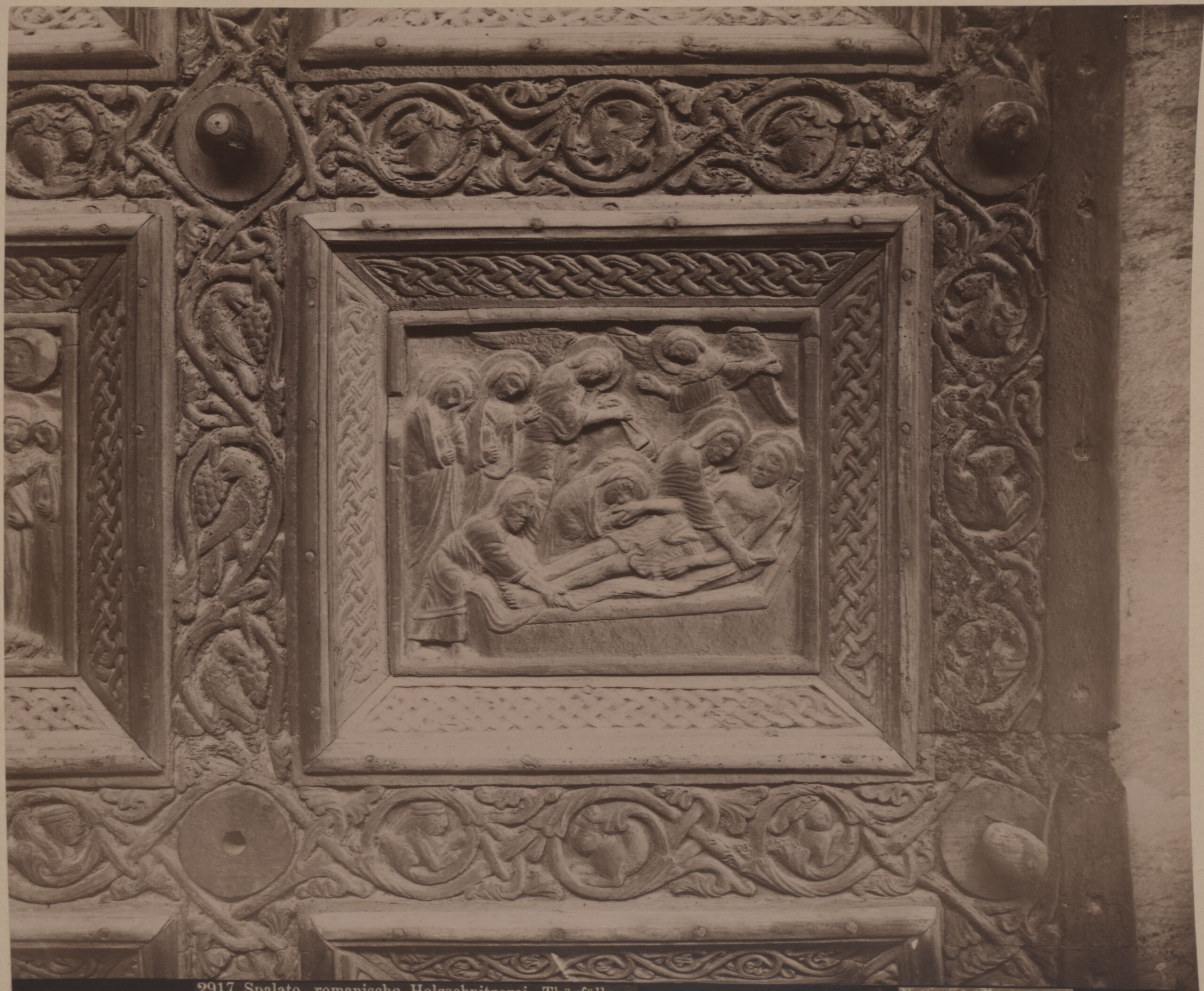 - text on object (unten) : 2917 Spalato, romanische Holzschnitzerei, Thürfüllung. Fotograf Wlha, Wien.