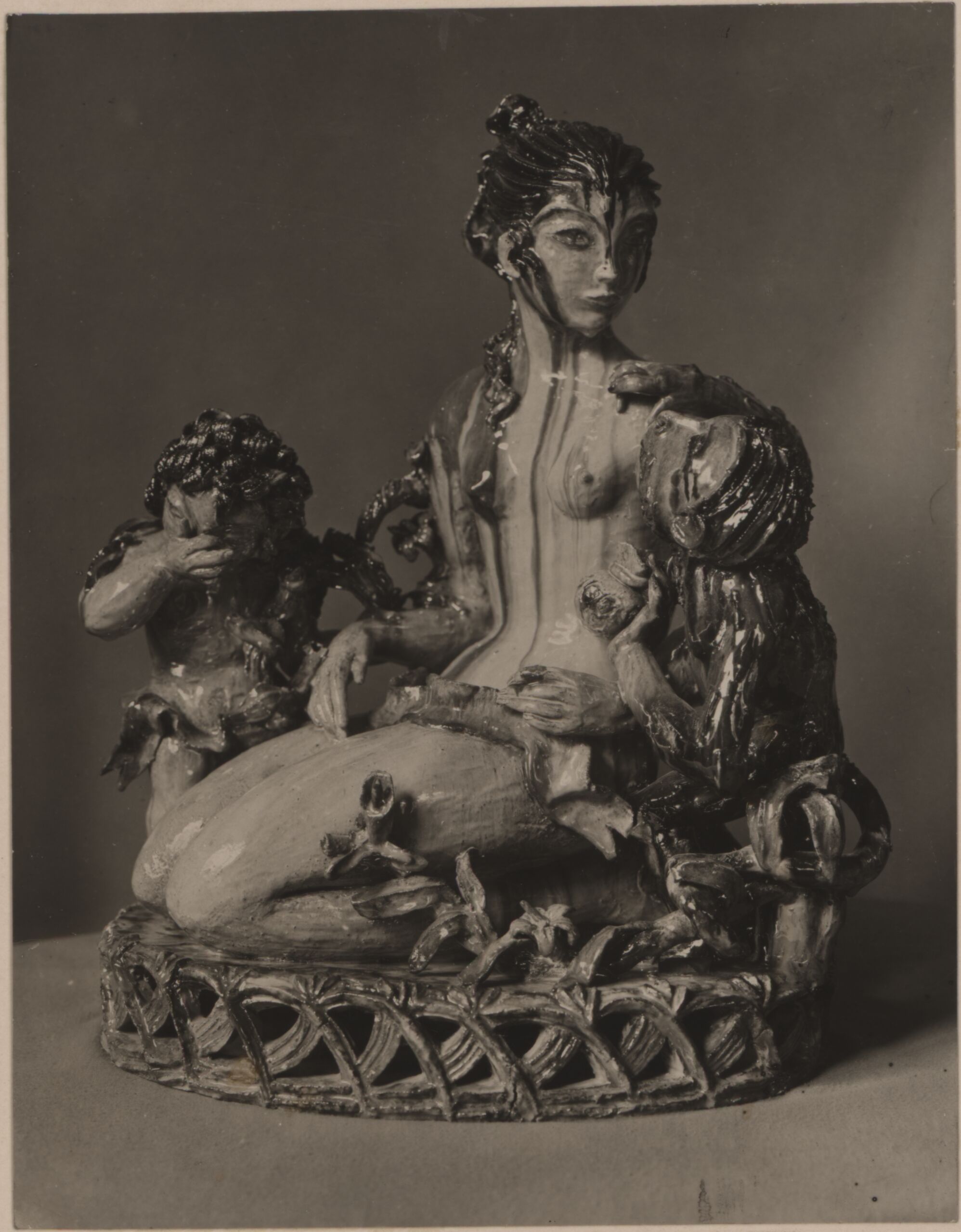 - Fotografie einer sitzenden, weiblichen Keramikfigur mit Äffchen von Vally Wieselthier (given title)