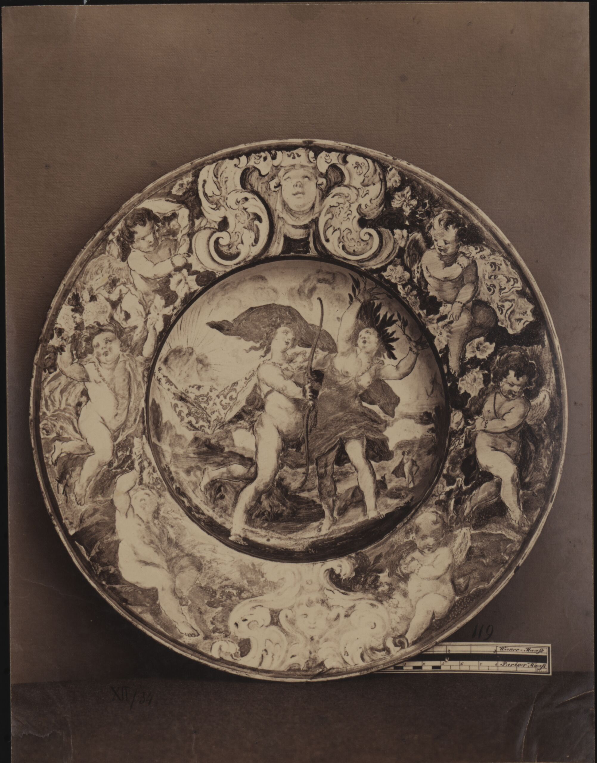 photograph, Fotografie eines bemalten Majolika-Tellers, mit einer Darstellung von Apollo und Daphne und Engeln, 16. Jh., Anonym, MAK Inv.nr. KI 505-1