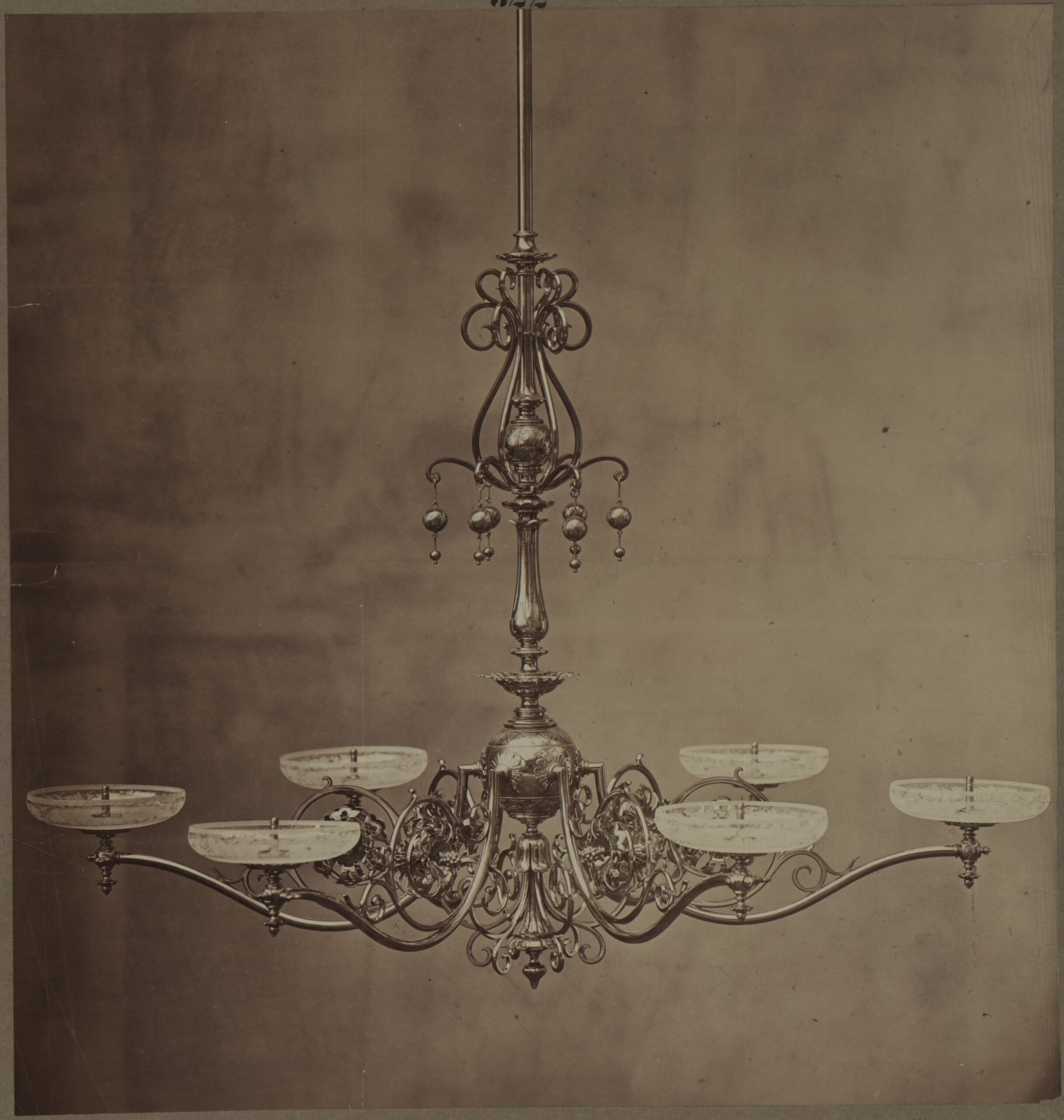- Fotografie eines bronzenen Lampenschirms der Erzgießerei und Bronzewarenfabrik D. Hollenbach (given title)