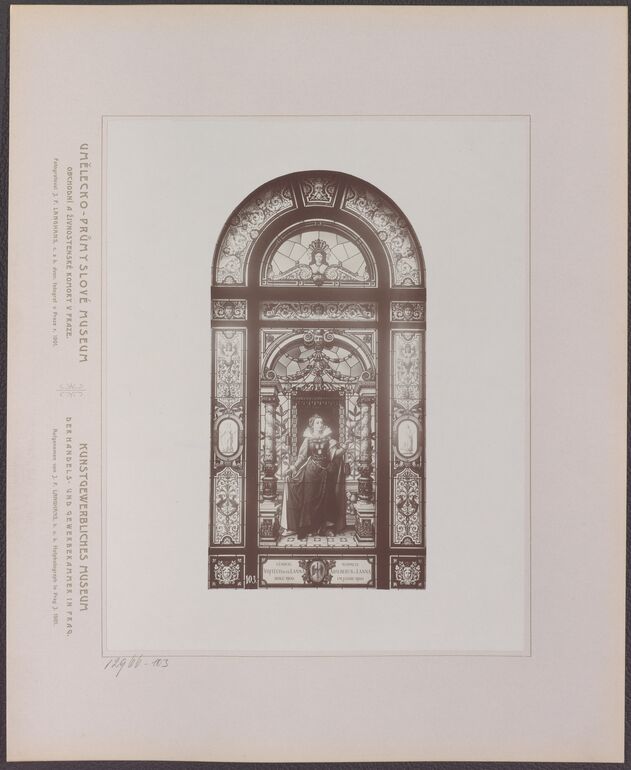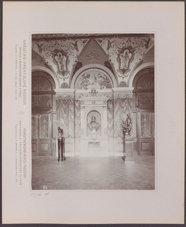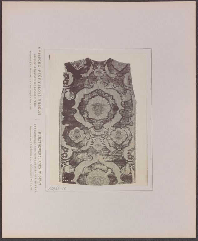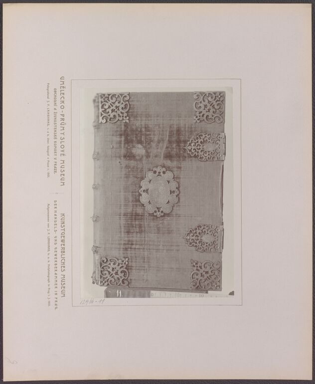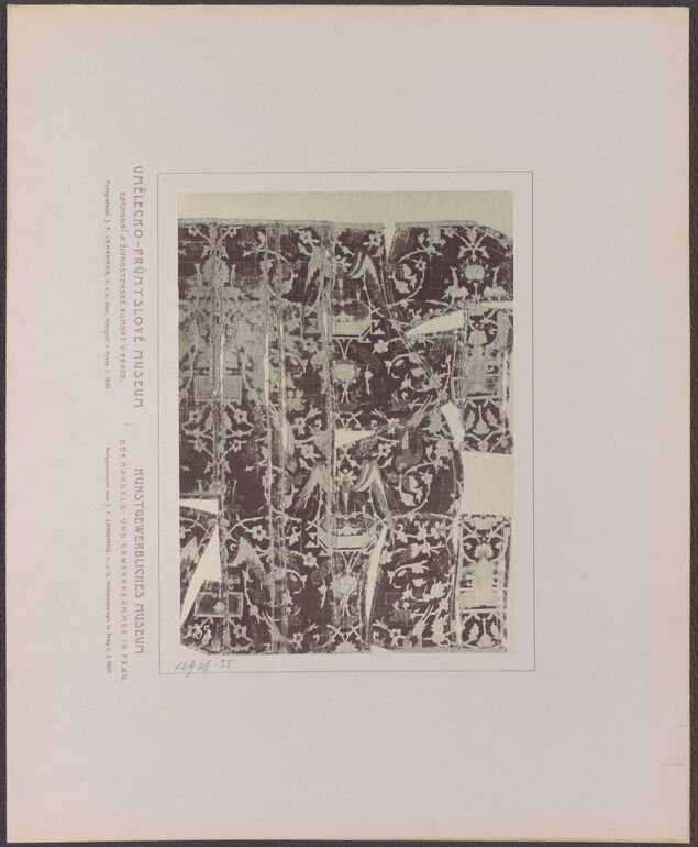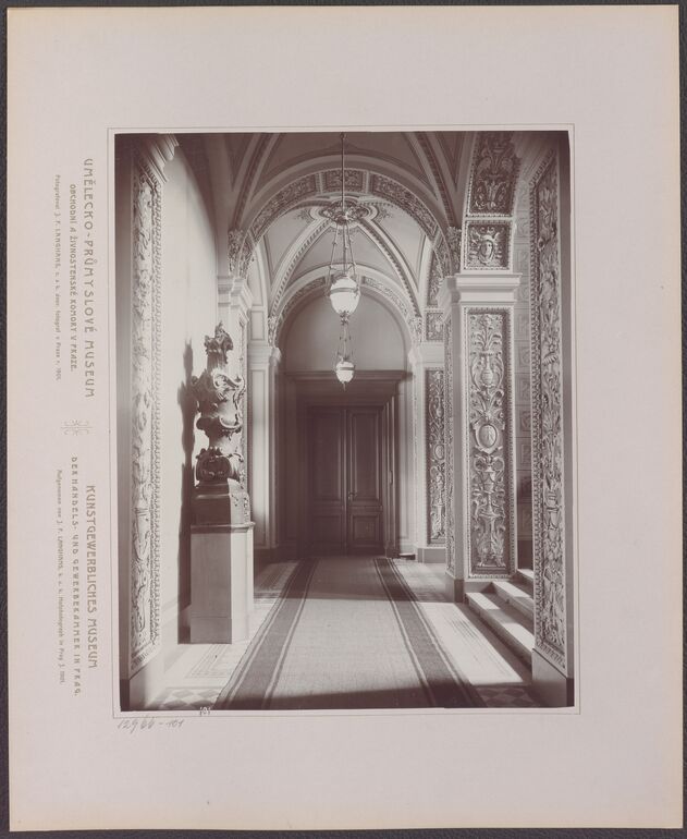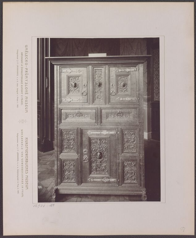 - text on object: [Untersatzkarton, links unten]: UMĚLECKO-PRŮMYSLOVÉ MUSEUM / OBCHODNÍ A ZIVNOSTENSKÉ KOMORY V PRAZE. / Fotografoval J. F. Langhans, c. a k. dvorni fotograf v Praze r. 1901.[Untersatzkarton, rechts unten]: KUNSTGEWERBLICHES MUSEUM / DER HANDELS- UND GEWERBEKAMMER IN PRAG. / Aufgenommen von J. F. Langhans, k. u. k. Hofphotograph in Prag J. 1901.