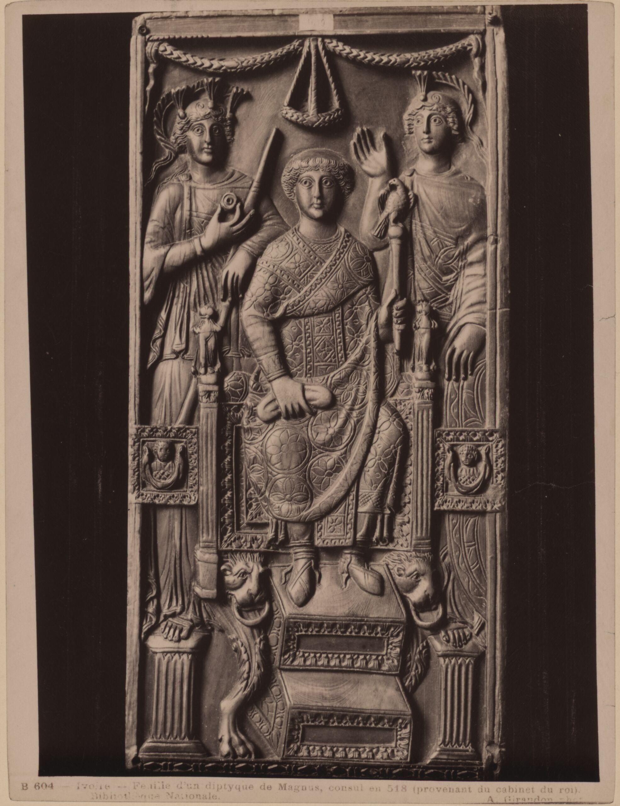 - text on object: [unten]: B 604 - Ivoire - Feuille d'un diptyche de Magnus, consul en 518 (provenant du cabinet du roi). / Bibliotheque Nationale. A. Giraudon, phot. [Untersatzkarton, links]: Paris, Bibliotheque Nationale [Untersatzkarton, rechts]: Hälfte des Diptychons des Konsul Magnus (518). Elfenbein- / schnitzerei.