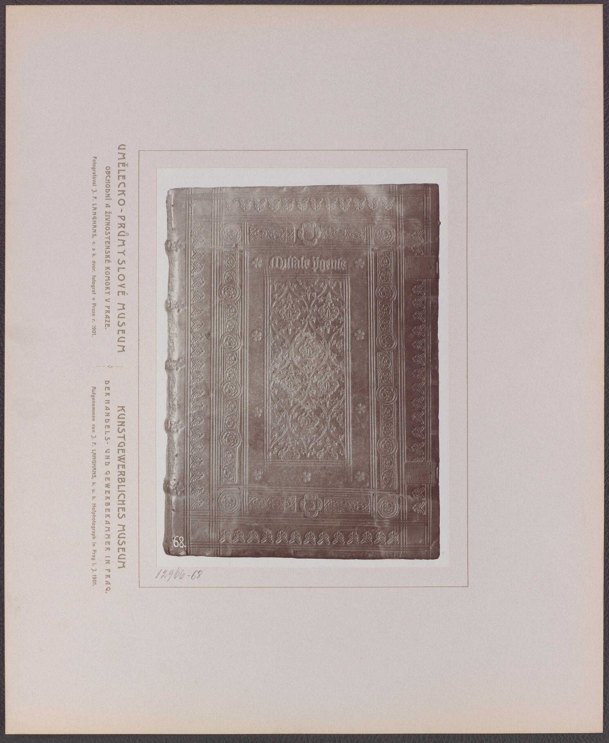 - text on object: [Untersatzkarton, links unten]: UMĚLECKO-PRŮMYSLOVÉ MUSEUM / OBCHODNÍ A ZIVNOSTENSKÉ KOMORY V PRAZE. / Fotografoval J. F. Langhans, c. a k. dvorni fotograf v Praze r. 1901.[Untersatzkarton, rechts unten]: KUNSTGEWERBLICHES MUSEUM / DER HANDELS- UND GEWERBEKAMMER IN PRAG. / Aufgenommen von J. F. Langhans, k. u. k. Hofphotograph in Prag J. 1901.