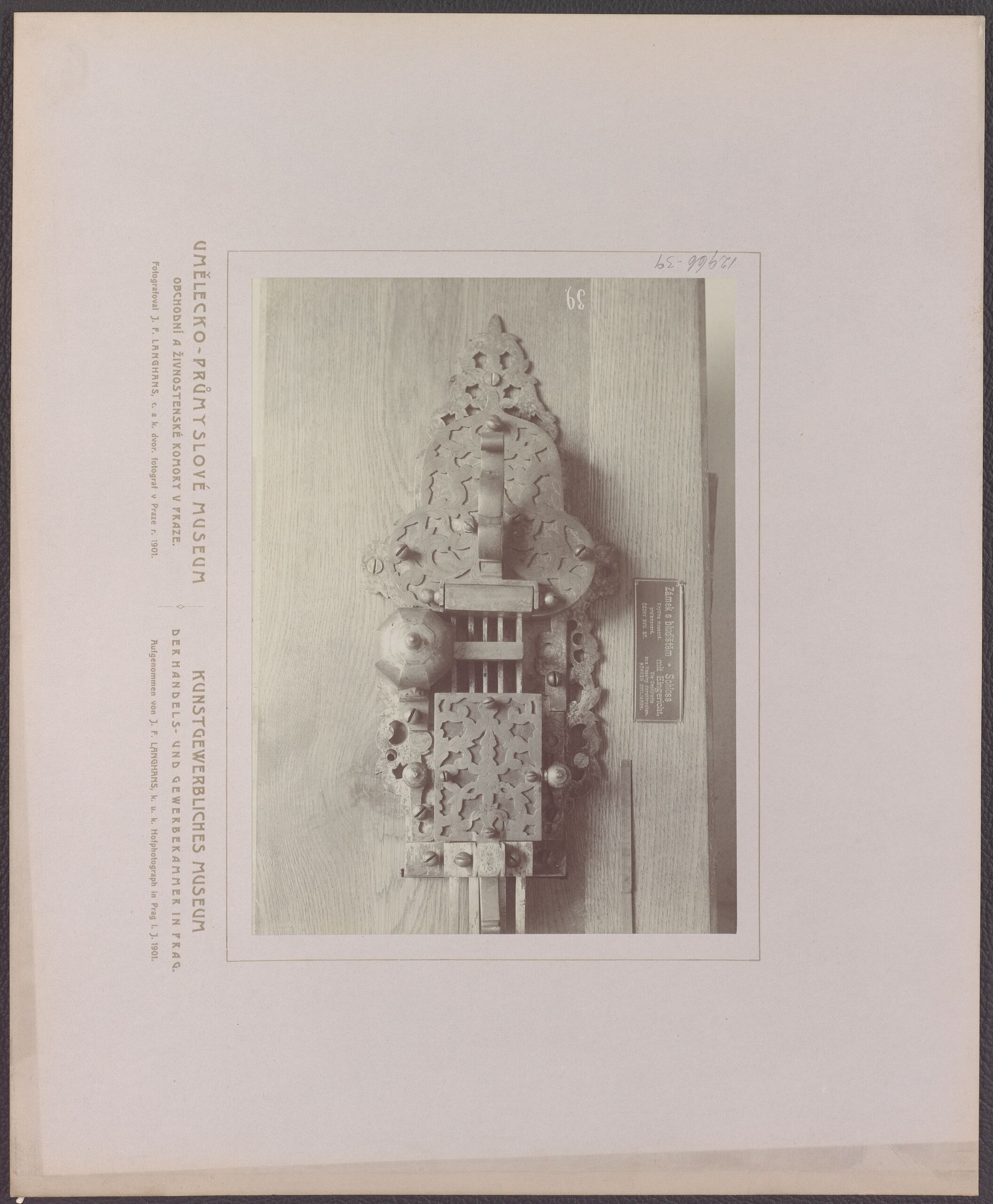 - text on object: [Untersatzkarton, links unten]: UMĚLECKO-PRŮMYSLOVÉ MUSEUM / OBCHODNÍ A ZIVNOSTENSKÉ KOMORY V PRAZE. / Fotografoval J. F. Langhans, c. a k. dvorni fotograf v Praze r. 1901.[Untersatzkarton, rechts unten]: KUNSTGEWERBLICHES MUSEUM / DER HANDELS- UND GEWERBEKAMMER IN PRAG. / Aufgenommen von J. F. Langhans, k. u. k. Hofphotograph in Prag J. 1901.